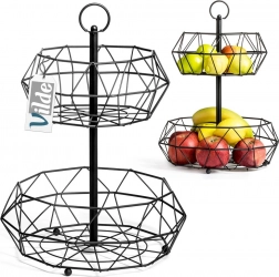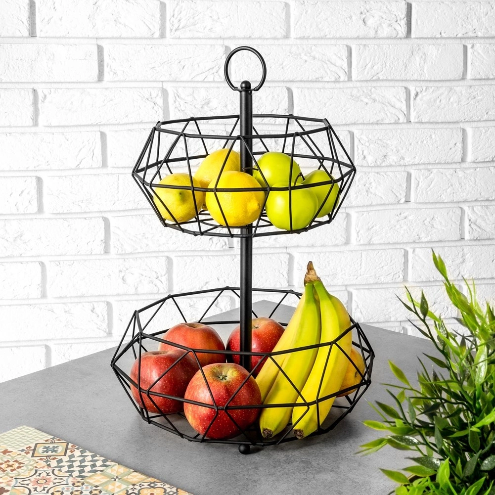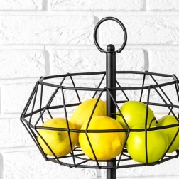 Elegancki dwupiętrowy kosz z metalowej konstrukcji drucianej w czarnym kolorze oferuje praktyczne przechowywanie owoców i warzyw z naturalną cyrkulacją powietrza. Dzięki nowoczesnemu geometrycznemu wzornictwu świetnie pasuje do nowoczesnych, industrialnych i glamour wnętrz, a jednocześnie jest stabilny, łatwy do przenoszenia i prosty w pielęgnacji.