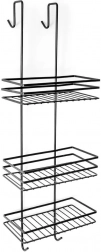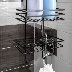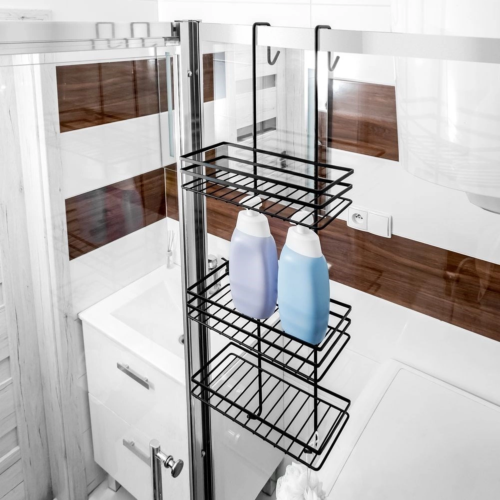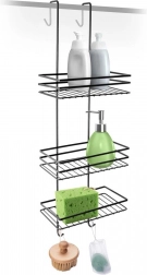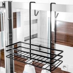 Półka oferuje 3 poziomy przechowywania na szampony, odżywki, mydła oraz większe opakowania oraz 4 praktyczne haczyki – dwa wewnątrz na gąbki i szczotki oraz dwa na zewnątrz na ręczniki lub szlafroki. Wystarczy zawiesić ją na górnej krawędzi szklanej ścianki kabiny prysznicowej i równie łatwo w każdej chwili zdjąć.