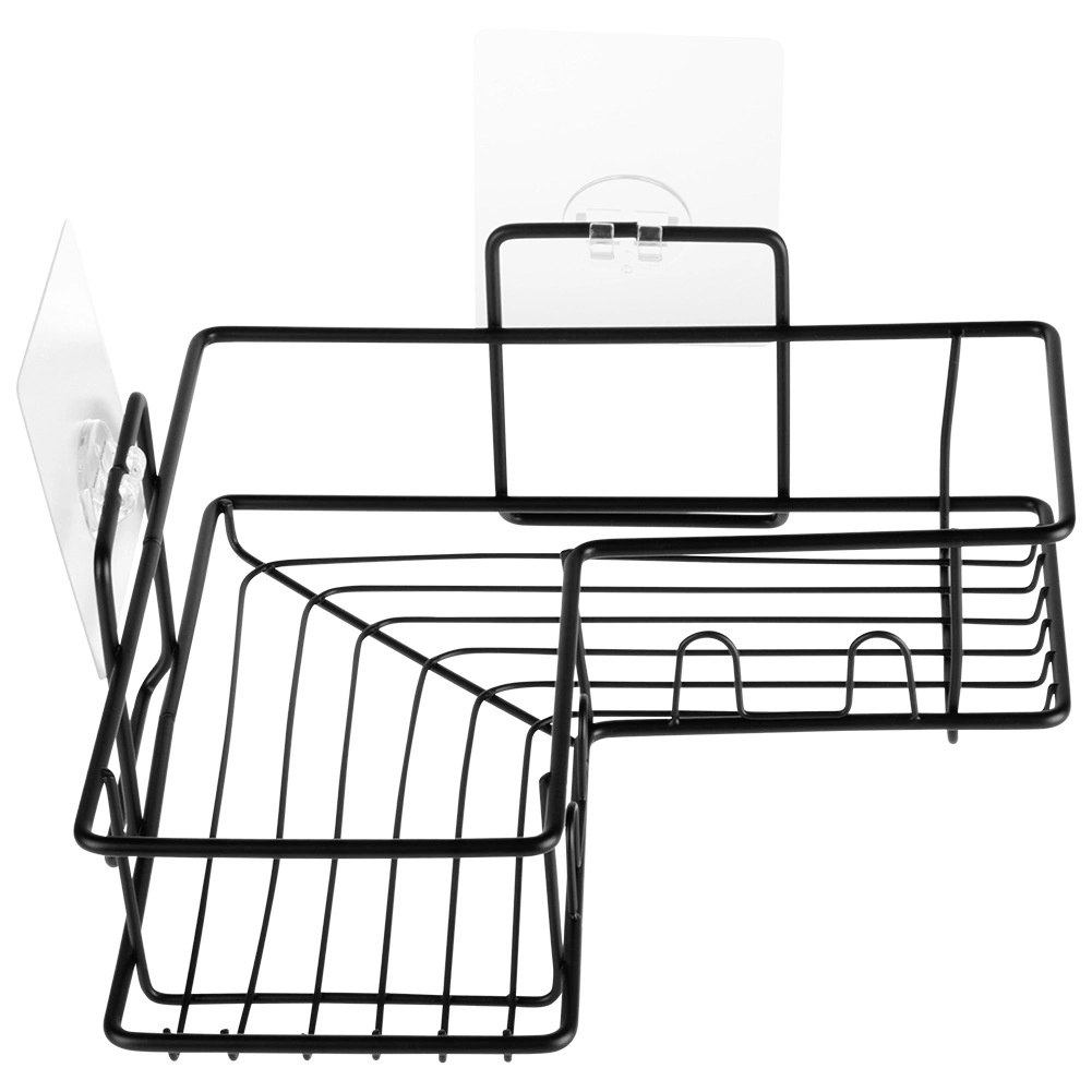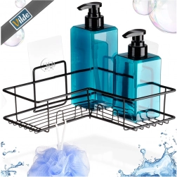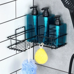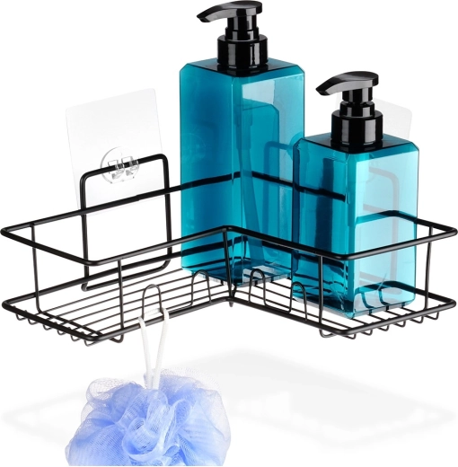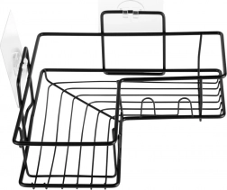 Praktyczna narożna półka do prysznica i łazienki z wytrzymałego, malowanego proszkowo metalu w czarnym kolorze do przejrzystego przechowywania kosmetyków i akcesoriów. Oferuje montaż bez wiercenia za pomocą samoprzylepnych podkładek, odporność na rdzę oraz otwartą, drucianą konstrukcję dla szybkiego odpływu wody. Idealna także do kuchni na przyprawy i drobiazgi.