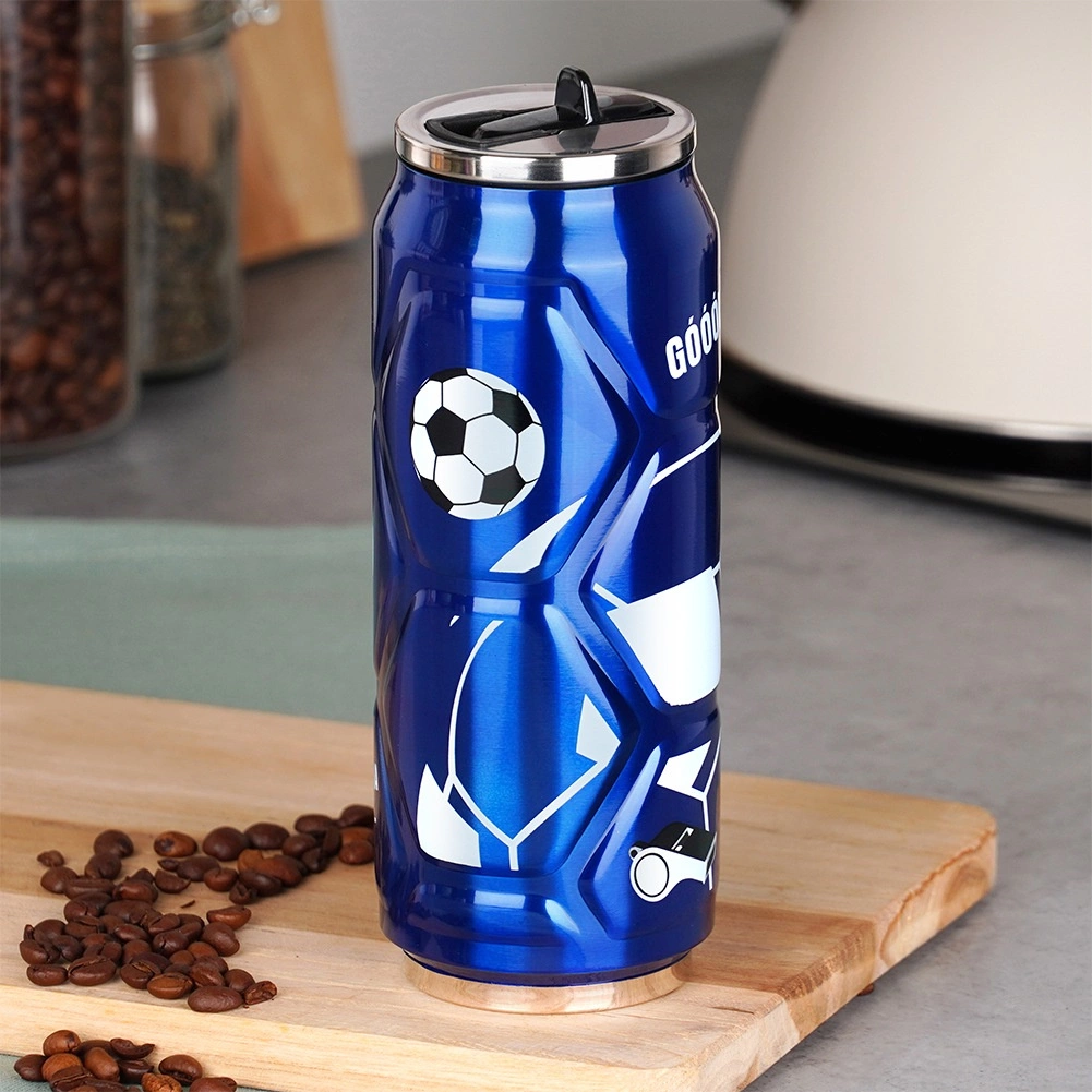 Delektuj się ulubionymi napojami w nowoczesnym termokubku w kształcie puszki z efektownym motywem piłkarskim na niebieskim tle. Wysokiej jakości stal nierdzewna na zewnątrz i wewnątrz gwarantuje trwałość oraz czysty smak bez niepożądanych zapachów. Izolacja próżniowa utrzymuje napoje gorące do 12 godzin, a zimne do 8 godzin – idealny w podróży, do biura i na sport.