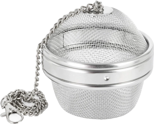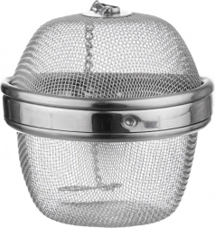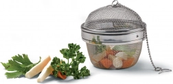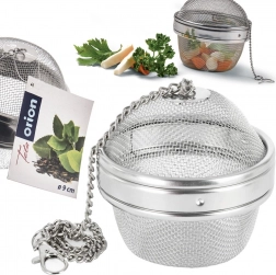 Praktyczne stalowe sitko na przyprawy o średnicy 9 cm i wysokości 8 cm, do łatwego doprawiania zup, wywarów oraz herbat. Dzięki drobnej, gęstej siatce uwalnia do potrawy aromat i smak ziół, jednocześnie zatrzymując ich resztki. Wykonane z wysokiej jakości stali nierdzewnej, z zatrzaskowym zamknięciem i łańcuszkiem z haczykiem do wygodnego zawieszenia na krawędzi garnka lub dzbanka.