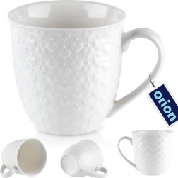 Duży biały ceramiczny kubek o pojemności 580 ml jest idealny do codziennego picia kawy lub herbaty. Ma wygodne ucho, stylowy relief z serduszek i dzięki wysokiej jakości ceramice jest odpowiedni do mikrofalówki i zmywarki. Świetny prezent i praktyczny dodatek do każdej kuchni.