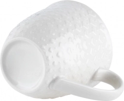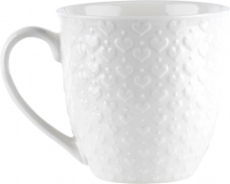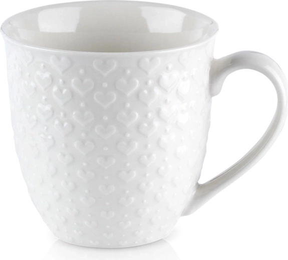 Delektuj się ulubioną kawą lub herbatą w dużej pojemności 580 ml. Ten biały ceramiczny kubek z wypukłym dekorem serduszek łączy elegancki wygląd i praktyczne zastosowanie na codzienne chwile relaksu. Ergonomiczne ucho wygodnie leży w dłoni i zapewnia pewny chwyt.