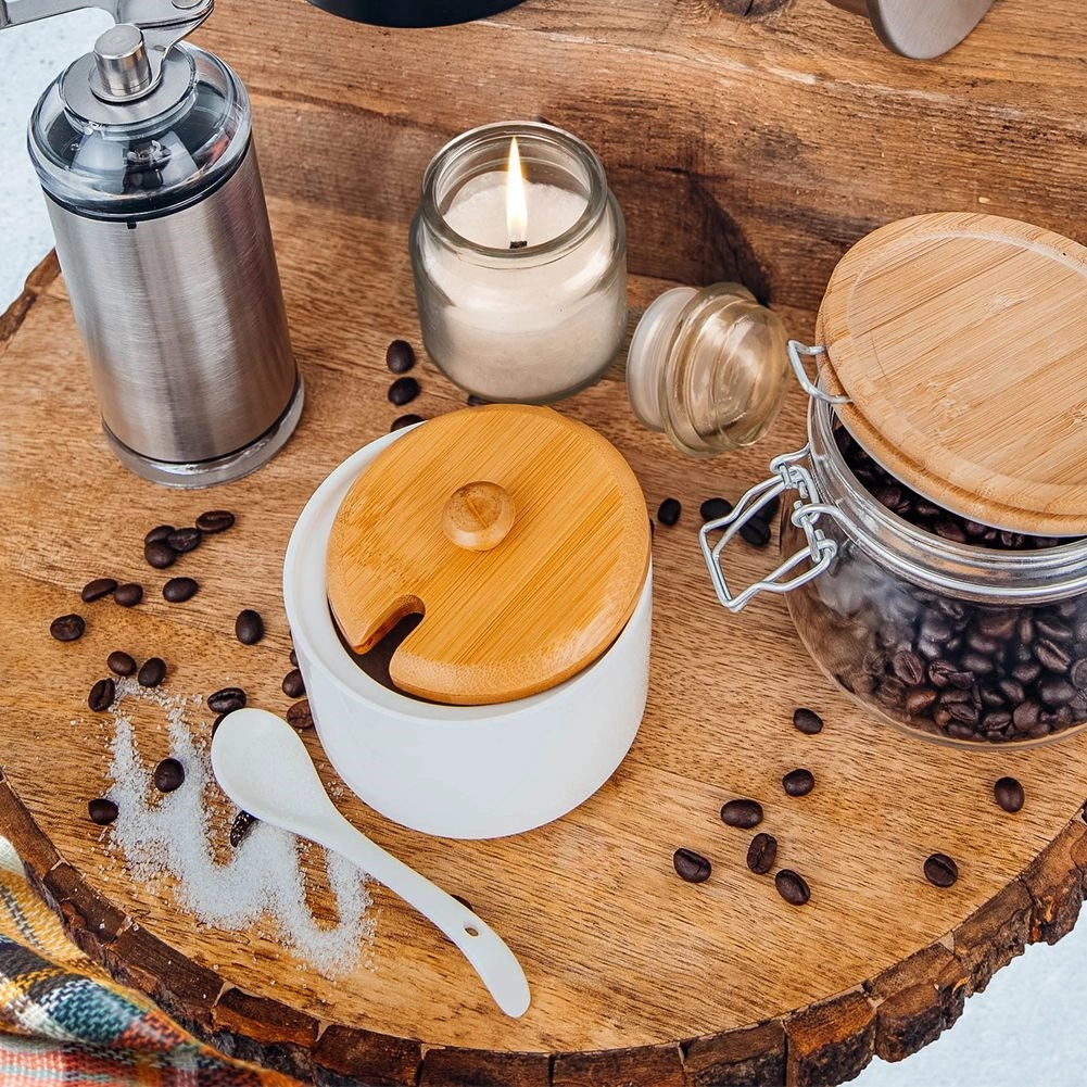 - Wysokiej jakości materiały – biała porcelana, bambusowa pokrywka, porcelanowa łyżeczka.
