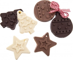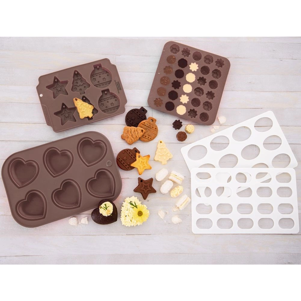 Ta brązowa silikonowa forma o świątecznej tematyce jest idealna do pieczenia ciasteczek i pierniczków oraz przygotowywania czekoladek i pralin. Sześć zagłębień w trzech ulubionych kształtach – gwiazda, choinka i bombka – tworzy efektowne słodkości z reliefem i otworem do zawieszenia na choince. Elastyczny i nieprzywierający silikon zapewnia łatwe wyjmowanie bez konieczności smarowania.