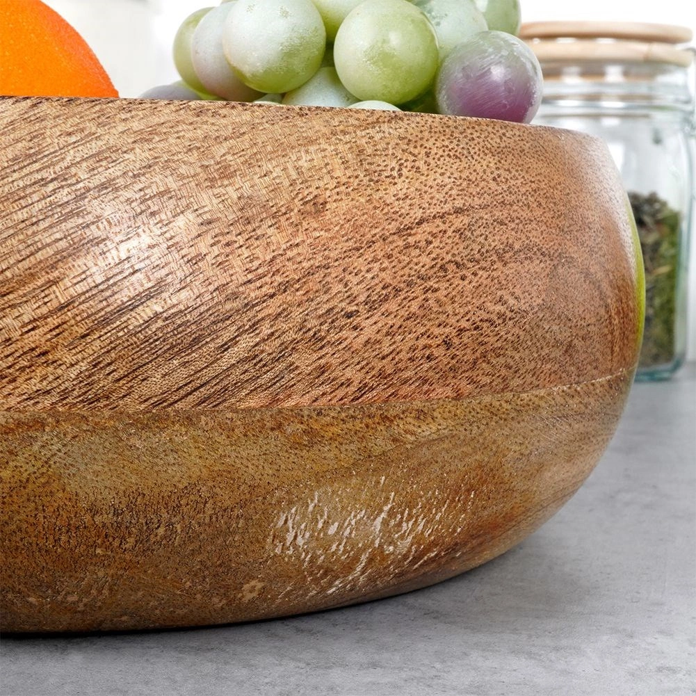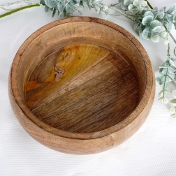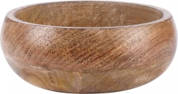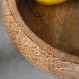 Ta miska z drewna mango łączy funkcjonalność i estetykę. Jest idealna do podawania orzechów, chipsów, popcornu, suszonych i świeżych owoców. Dzięki naturalnemu odcieniowi i wyrazistej strukturze drewna pasuje do każdego nakrycia stołu i sama w sobie stanowi dekoracyjny element.