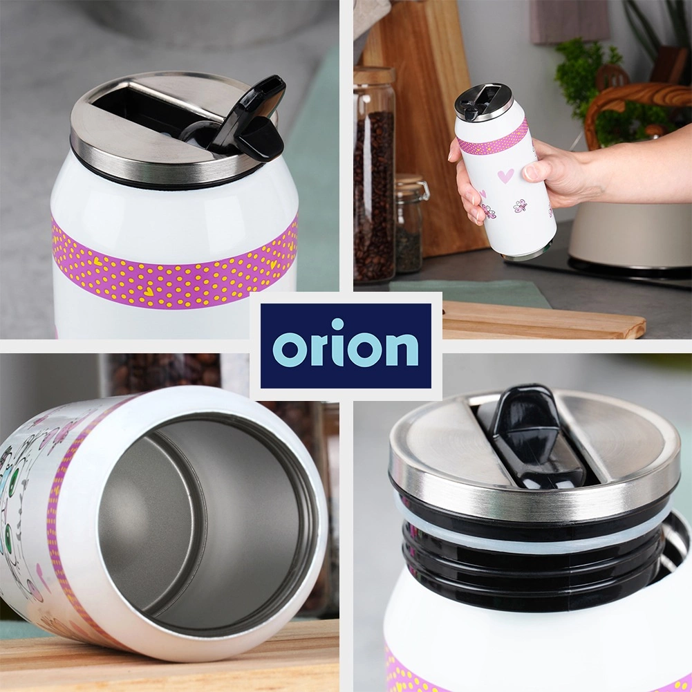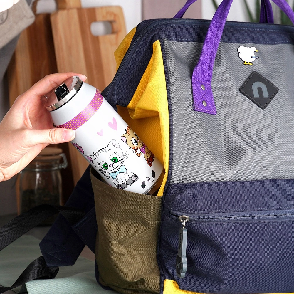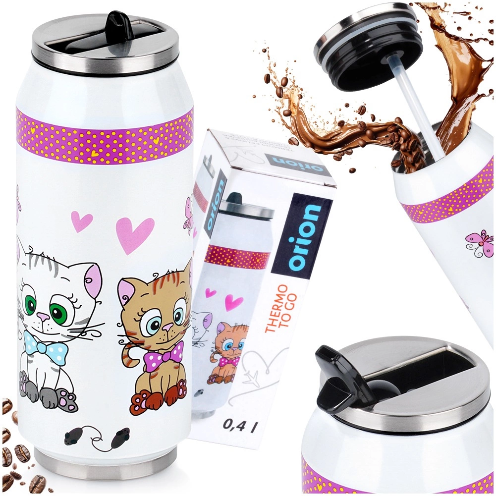 Stylowy termokubek w kształcie puszki o pojemności 400 ml utrzymuje Twoje napoje gorące do 12 godzin i zimne do 8 godzin. Ma podwójne ścianki z izolacją próżniową, jest w całości z nierdzewnej stali i wyróżnia się uroczym motywem kotów. Dzięki odchylanemu ustnikowi ze słomką pijesz bez przechylania, a uszczelniona pokrywka zapobiega przeciekaniu w torbie lub plecaku.