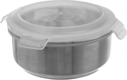 Ten okrągły stalowy pojemnik to świetny pomocnik do przechowywania i przenoszenia żywności w domu, w pracy i w podróży. Przezroczysta pokrywka z czterema solidnymi klipsami i gumową uszczelką zapewnia niezawodną szczelność i dłuższą świeżość produktów. Misa z wysokiej jakości stali nierdzewnej jest trwała, higieniczna i łatwa do utrzymania w czystości.