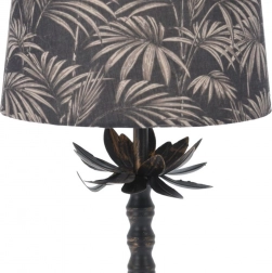 Ta wyjątkowo stylowa lampa stołowa łączy w sobie klasyczną elegancję i nowoczesny design. Czarny tekstylny abażur ze złotym wzorem liści tworzy przyjemną atmosferę i staje się wyrazistym elementem dekoracyjnym w salonie, sypialni, gabinecie czy biurze. Metalowa podstawa z patynowanym wykończeniem nadaje lampie charakter vintage i poczucie stabilności.