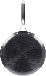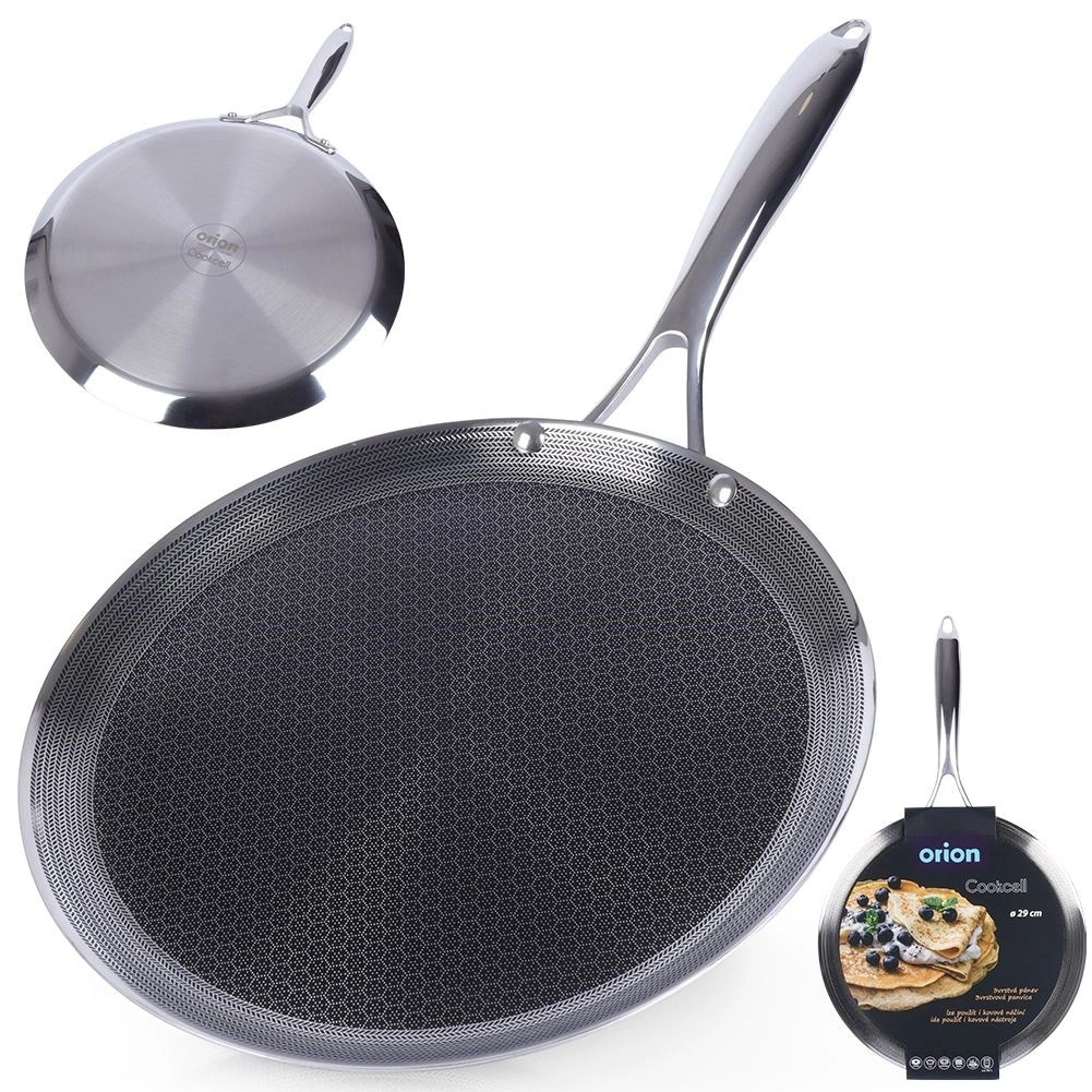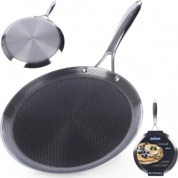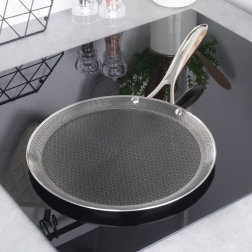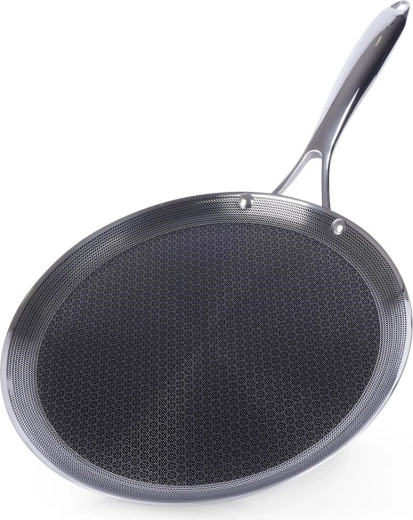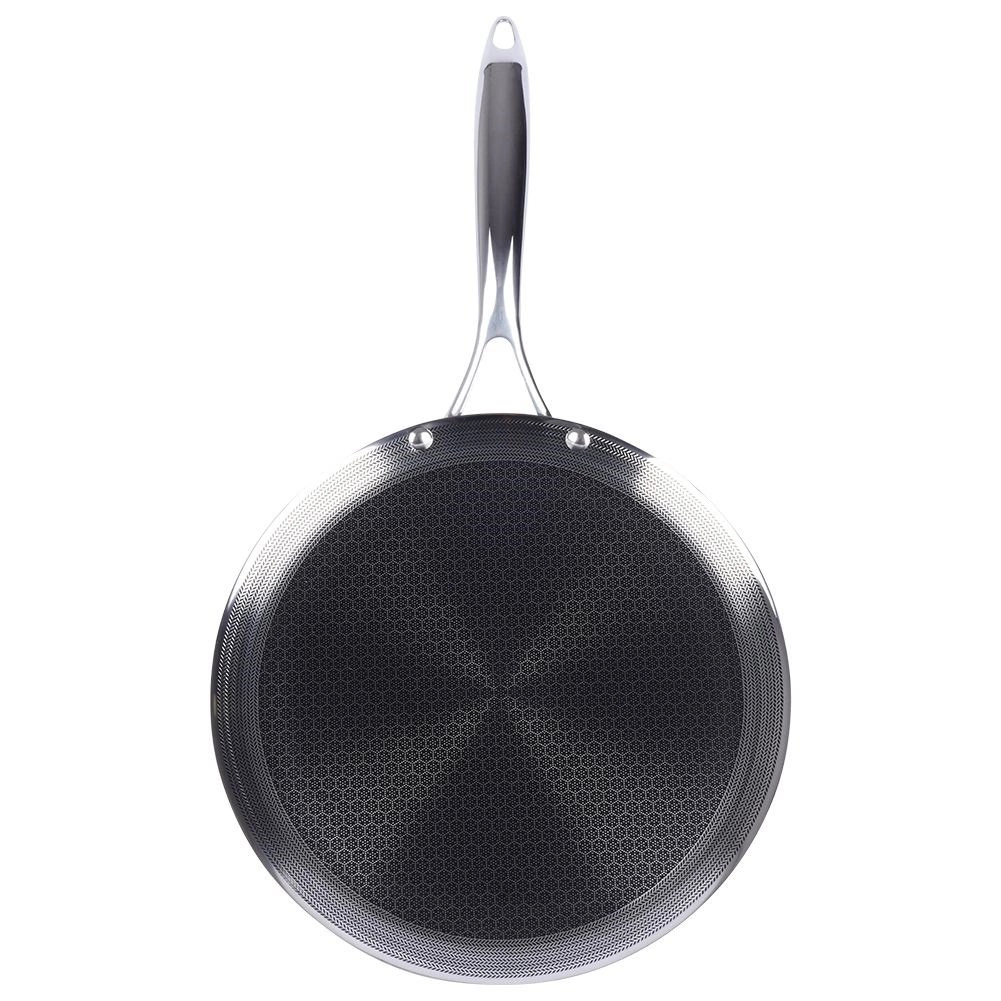 Premiumowa patelnia do naleśników ze stali nierdzewnej z hybrydową powierzchnią nieprzywierającą zapewniającą szybkie i równomierne smażenie. Odpowiednia do wszystkich typów kuchenek, w tym indukcji, do piekarnika do 260 °C oraz do zmywarki. Odporna na zarysowania, umożliwia użycie metalowych narzędzi, a dzięki niskiej krawędzi świetnie nadaje się do przewracania naleśników, placuszków i omletów.