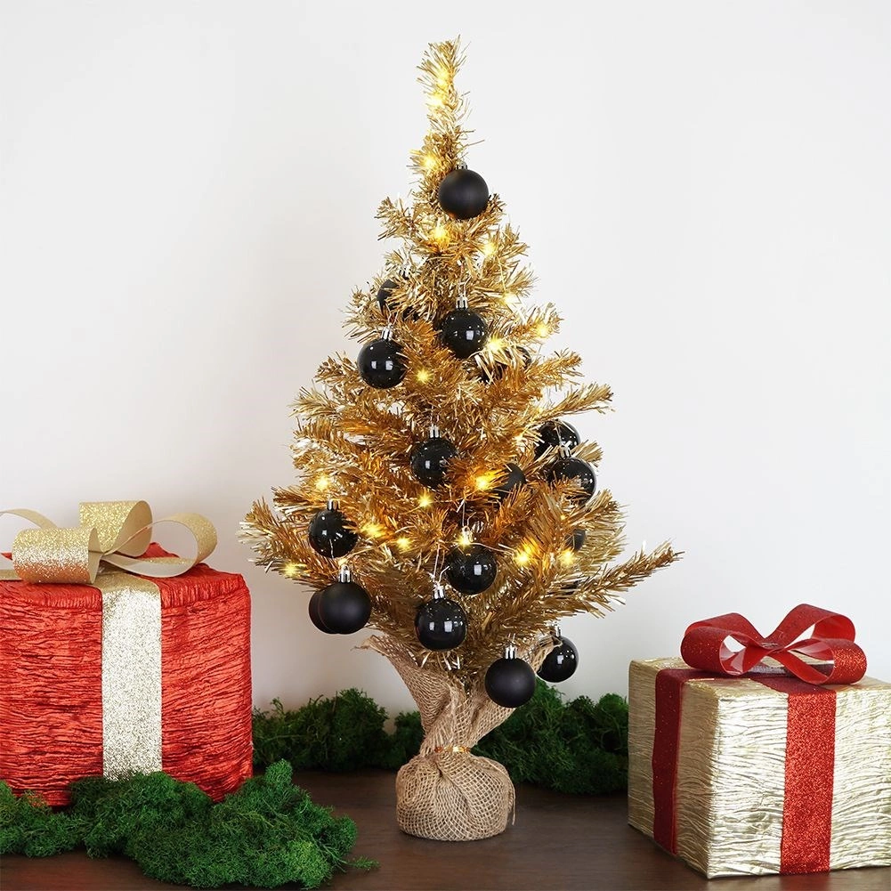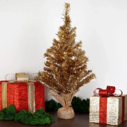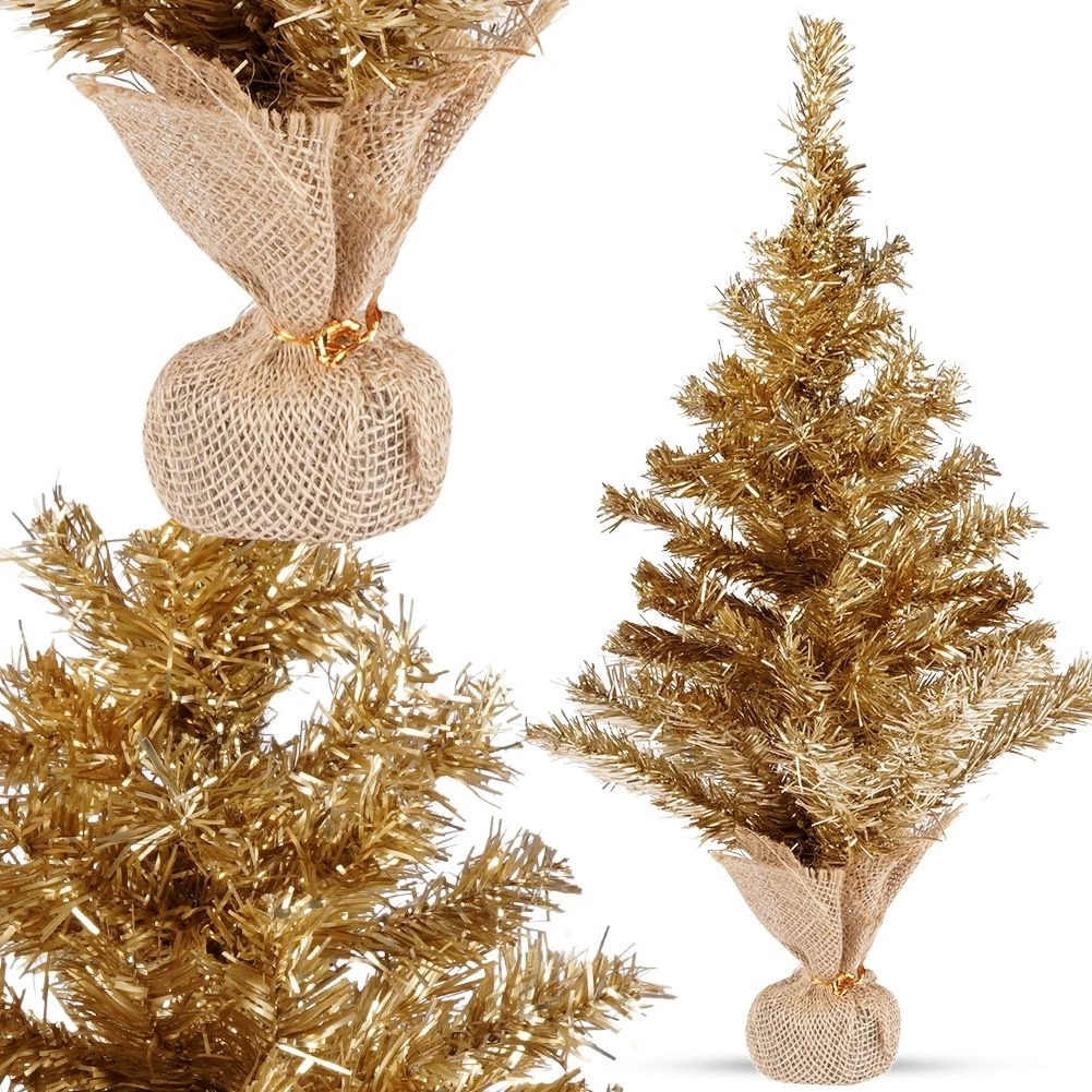 Ta kompaktowa sztuczna choinka w luksusowym złotym kolorze doskonale sprawdzi się w mieszkaniu, biurze i mniejszych przestrzeniach. Dzięki solidnemu metalowemu rdzeniowi i stabilnej betonowej podstawie w jutowym obszyciu pewnie stoi i łatwo ją umieścić na stole, półce lub parapecie.