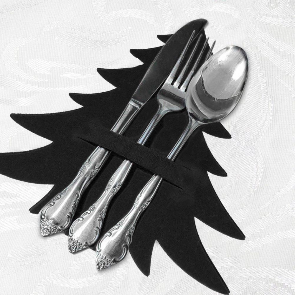 Stylowy świąteczny zestaw czterech etui na sztućce w kształcie choinki z czarnego filcu doda Twojemu nakryciu stołu eleganckiego, odświętnego charakteru. Dzięki dwóm szczelinom łatwo uporządkujesz łyżkę, widelec i nóż, wszystko będzie przejrzyście w jednym miejscu. Trwałe wykonanie i wielorazowe użycie gwarantują długą żywotność i perfekcyjny wygląd każdego stołu.