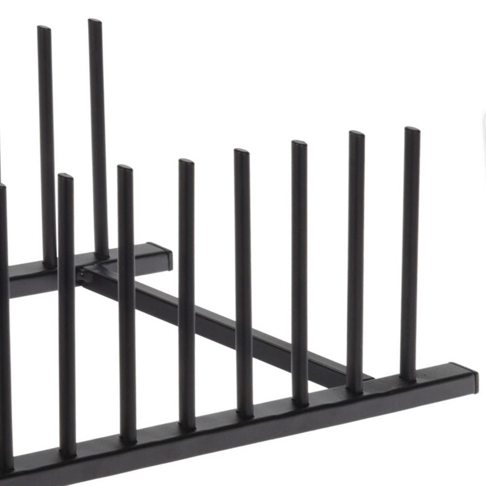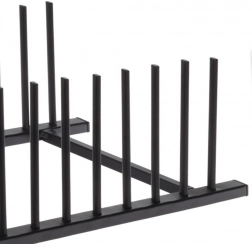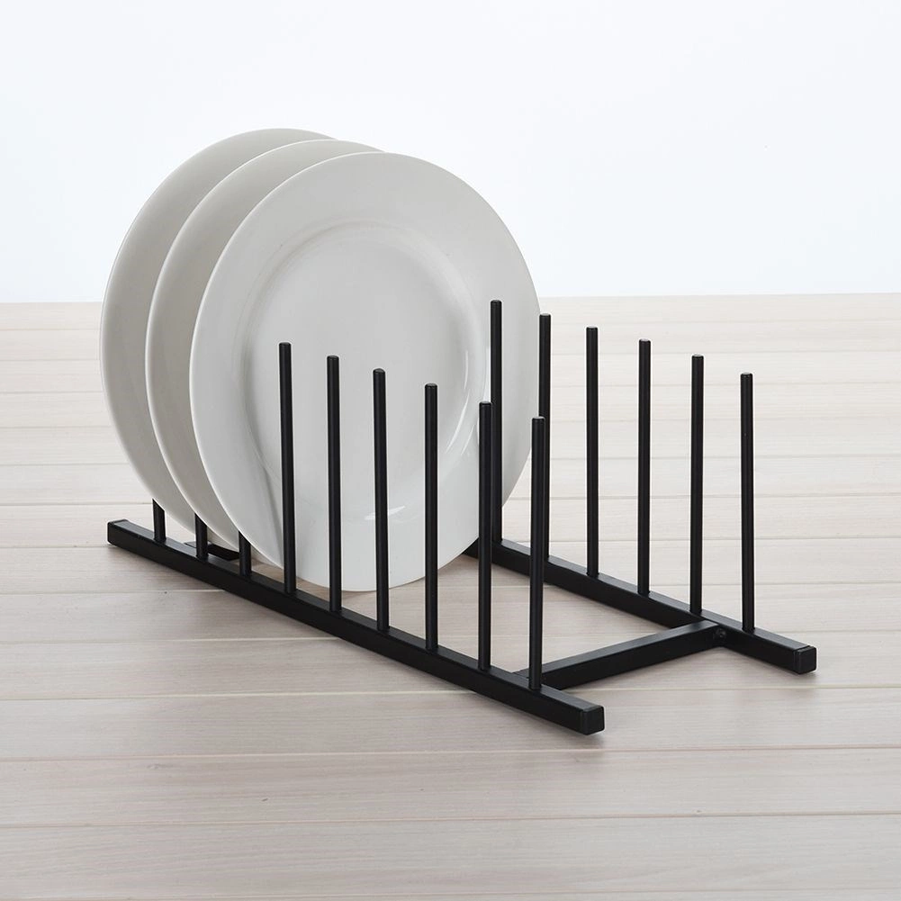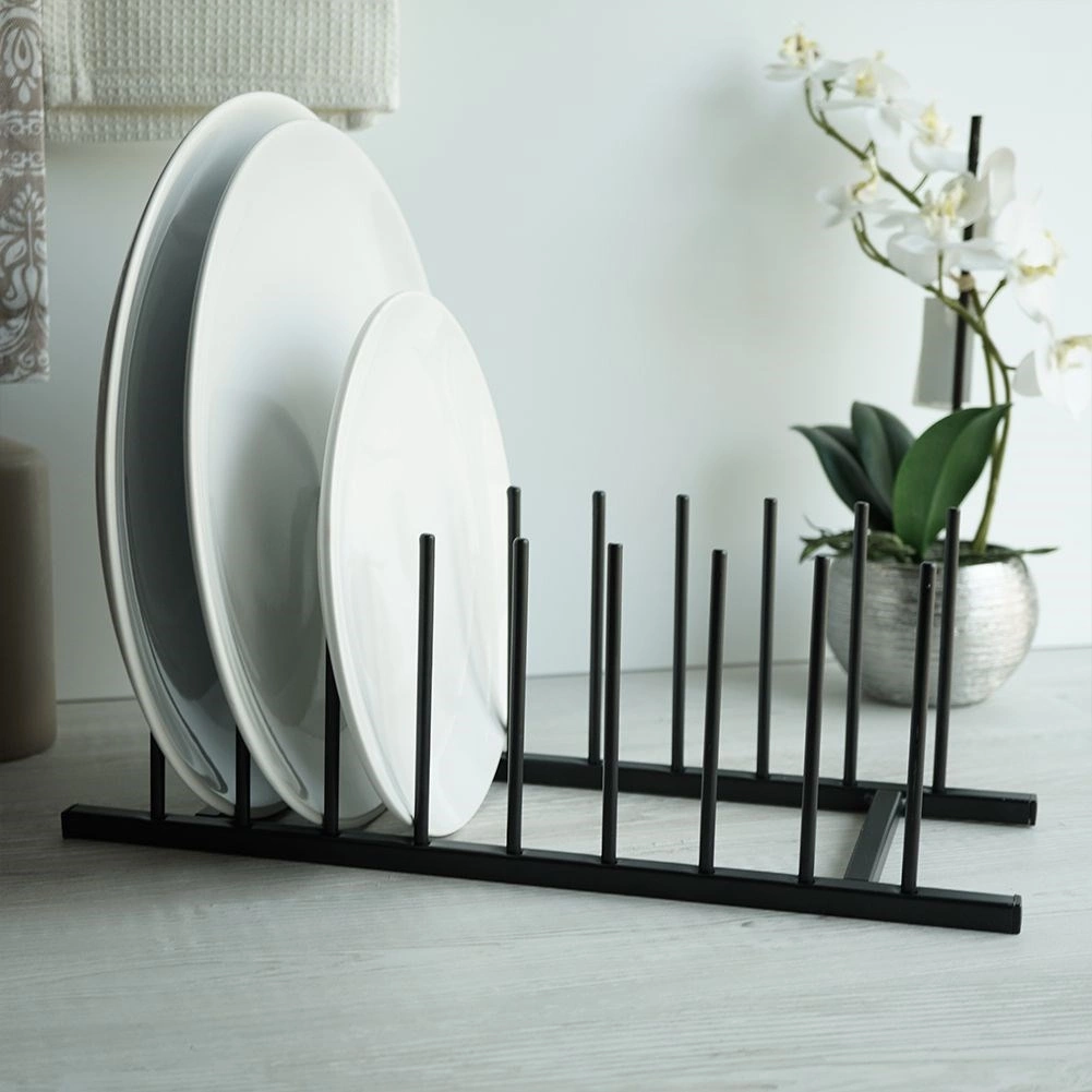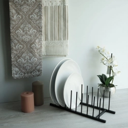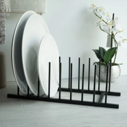 Praktyczny organizer kuchenny do przejrzystego przechowywania aż 8 talerzy lub pokrywek w pionowej pozycji. Trwała metalowa konstrukcja w czarnym kolorze wpisuje się w nowoczesny, industrialny styl i pomaga oszczędzać miejsce w szufladach i szafkach, chroni naczynia przed zarysowaniami oraz ułatwia suszenie i organizację.