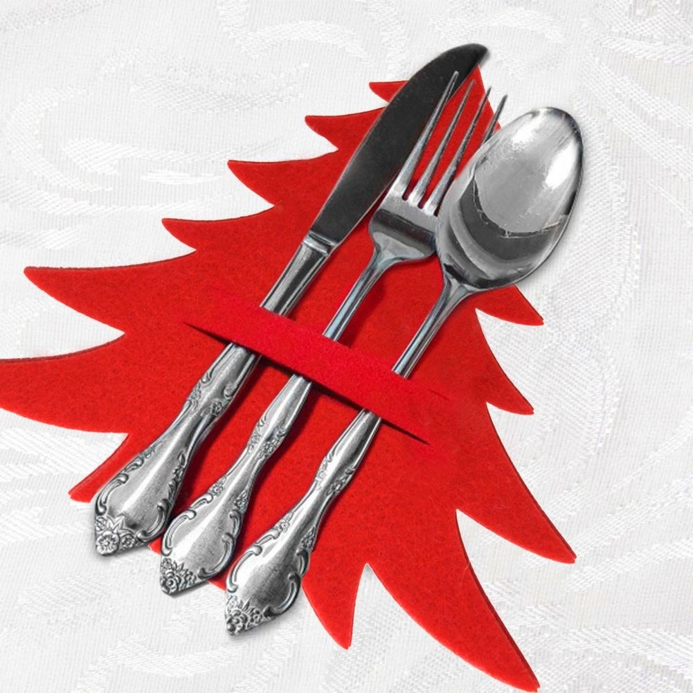 Zestaw 4 sztuk dekoracyjnych etui na sztućce w kształcie choinki z solidnego czerwonego filcu. Dzięki poziomemu nacięciu bezpiecznie i przejrzyście przechowasz łyżkę, widelec i nóż w jednym miejscu. Stylowy dodatek, który natychmiast podkreśli świąteczny nastrój przy każdym nakryciu.