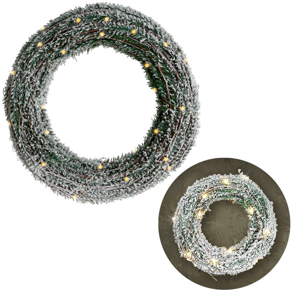 Elegancki świąteczny wieniec o średnicy 40 cm z 30 ciepłymi diodami LED dla przytulnej atmosfery. Oferuje realistyczne igliwie z efektem śniegu, możliwość zawieszenia lub postawienia, timer 6/18 h oraz zasilanie bateryjne, co ułatwia umieszczenie w dowolnym miejscu wewnątrz pomieszczeń.