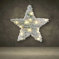 Ta dekoracyjna gwiazda świąteczna łączy naturalny, wiklinowy wygląd z sztucznymi gałązkami iglastymi z efektem śniegu. Zintegrowane ciepłe białe LED równomiernie podświetlają kształt gwiazdy, tworząc przyjemne, przytulne światło na zimowe wieczory. Dzięki średnicy 30 cm wyróżni się w każdym wnętrzu — czy to zawieszona na drzwiach, w oknie, czy swobodnie oparta na półce.
