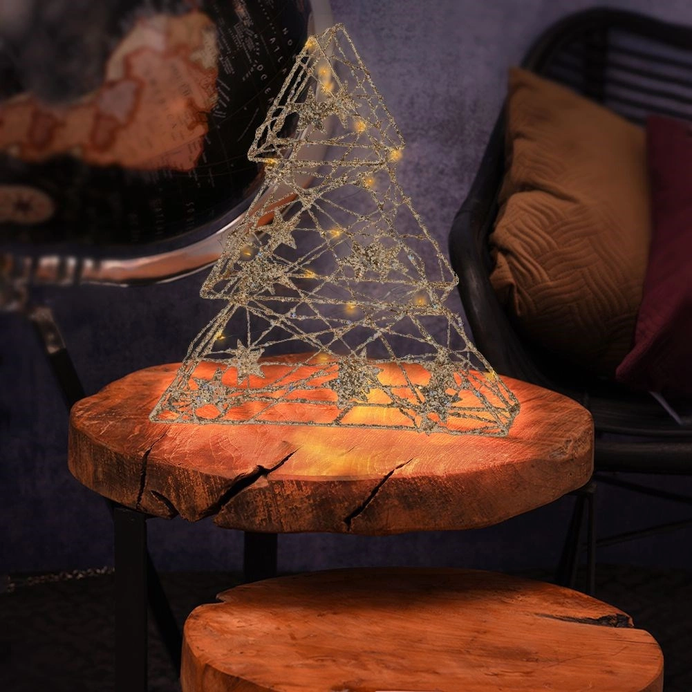 Wnieś do domu przytulne światło Świąt. Ta metalowa choinka w złotym wykończeniu z iskrzącym efektem i gwiazdkami tworzy przyjemną, uroczystą atmosferę. Ciepłe białe LED subtelnie podświetlają drucianą konstrukcję, dodając Twojemu wnętrzu luksusowego, zimowego charakteru.