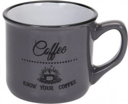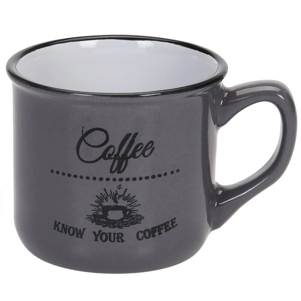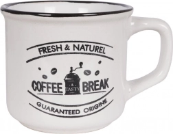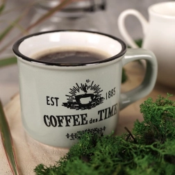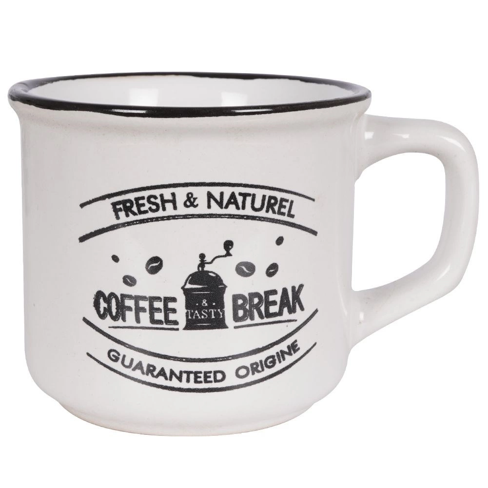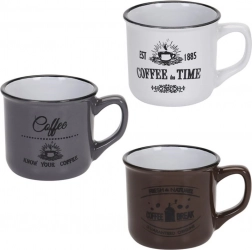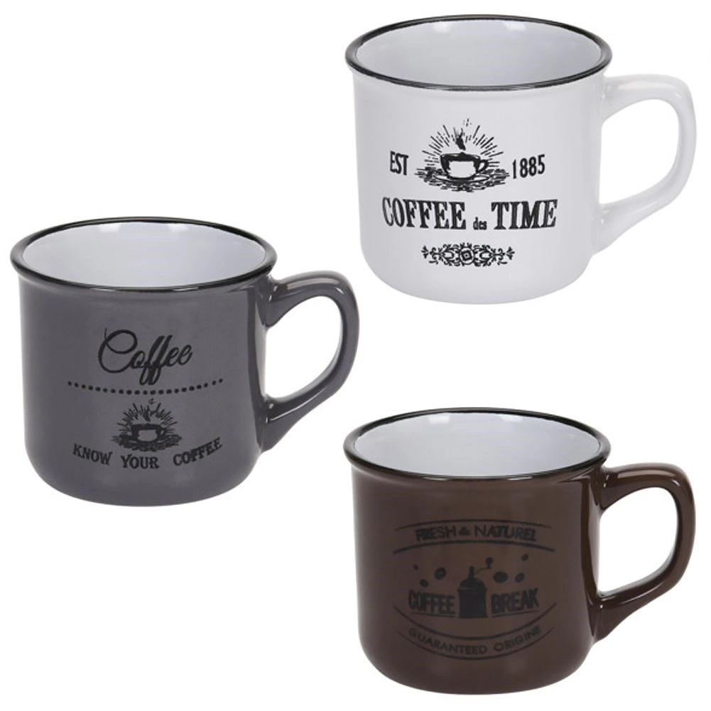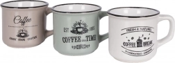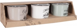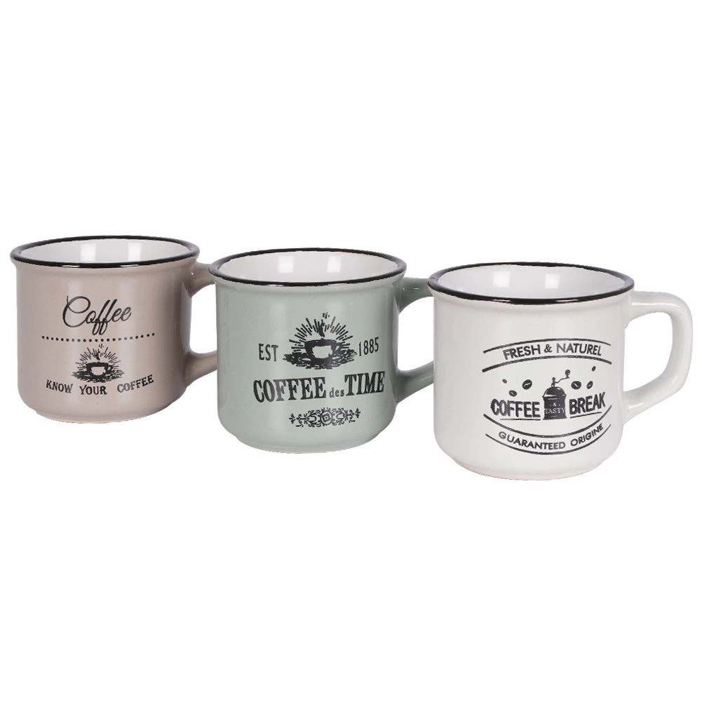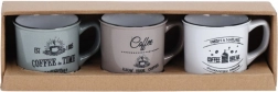 Stylowy zestaw trzech ceramicznych kubków o pojemności 160 ml do codziennej kawy, herbaty lub kakao. Oferują wysokiej jakości ceramikę, wygodne ucho, możliwość mycia w zmywarce oraz podgrzewania w kuchence mikrofalowej. Dzięki vintage nadrukom kawowym i czarnej krawędzi świetnie uzupełnią nowoczesną i rustykalną zastawę stołową.