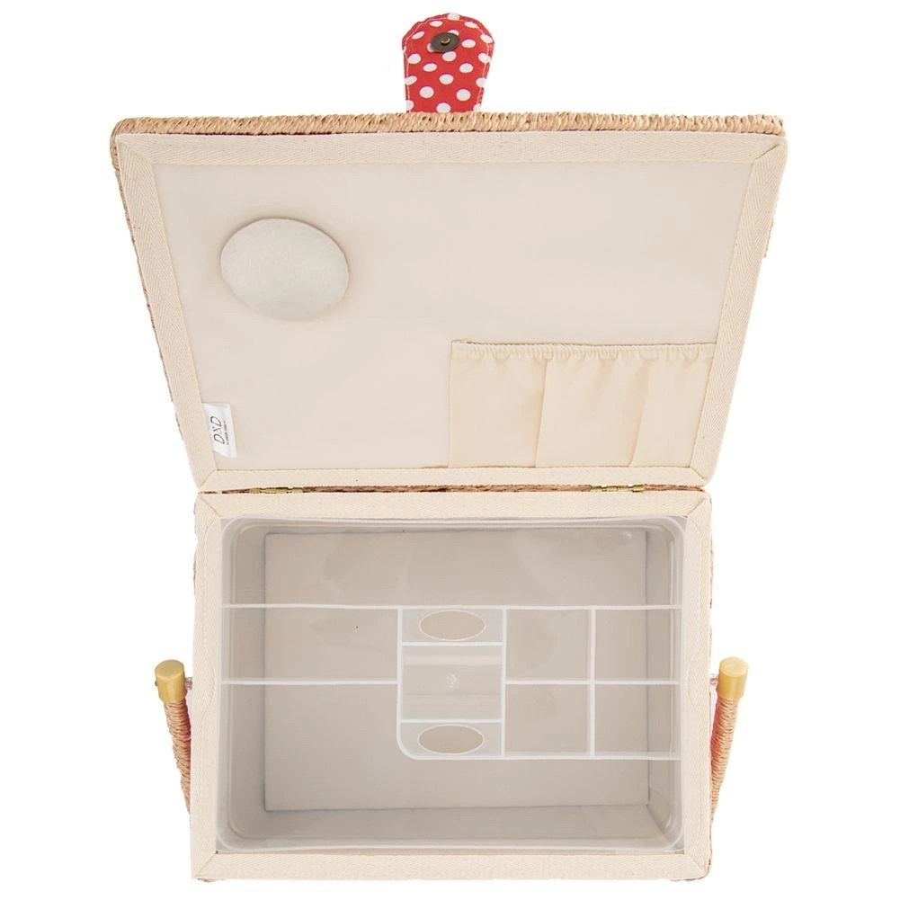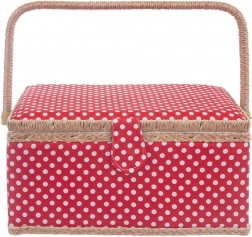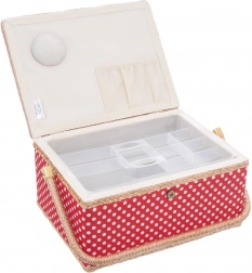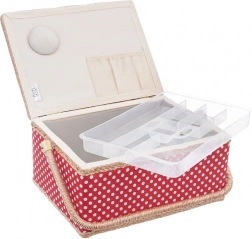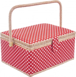 Ten koszyk do szycia łączy atrakcyjny design i przemyślaną organizację. Korpus koszyka jest pokryty tkaniną w czerwonym kolorze z białymi kropkami i uzupełniony solidnym uchwytem do łatwego przenoszenia. Dzięki magnetycznemu zapięciu koszyk zamkniesz pewnie jednym ruchem, a zawartość pozostanie na miejscu także w trakcie transportu.