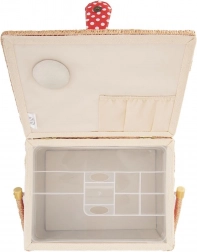 W środku znajdziesz wyjmowany plastikowy organizer z 4 przegródkami na nici, igły, nawlekacze czy guziki. Po jego wyjęciu zyskujesz pojemną komorę na większe akcesoria krawieckie. Wewnętrzna strona pokrywy jest wyposażona w elastyczną kieszeń i poduszeczkę na igły, w którą wygodnie wbijesz szpilki i igły. Koszyk doskonale sprawdzi się także jako organizer na biżuterię.