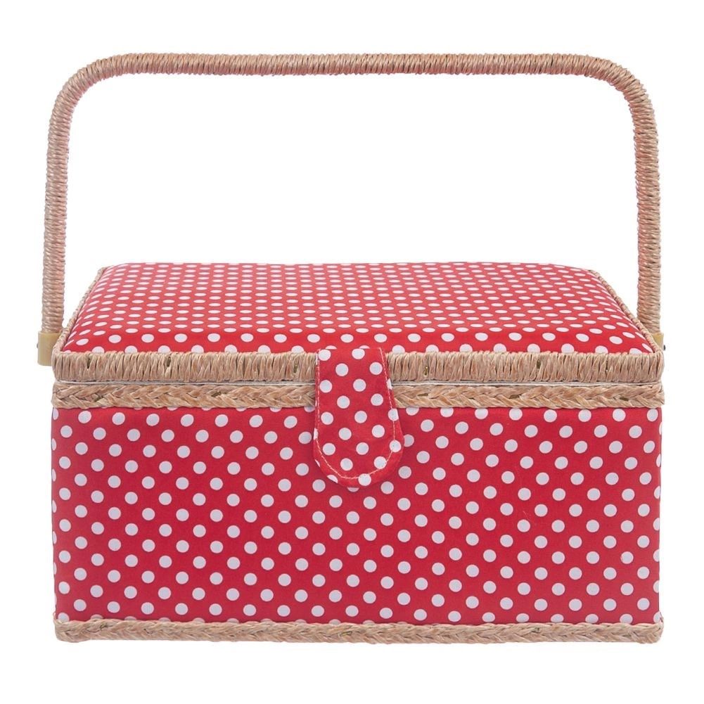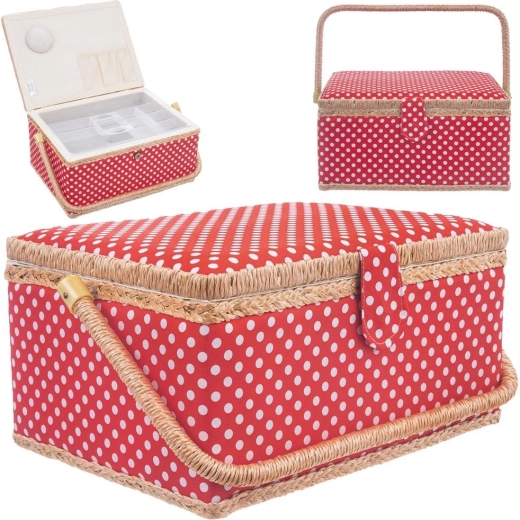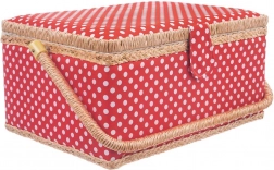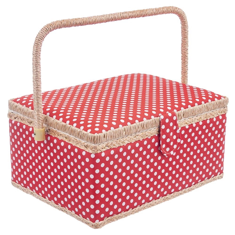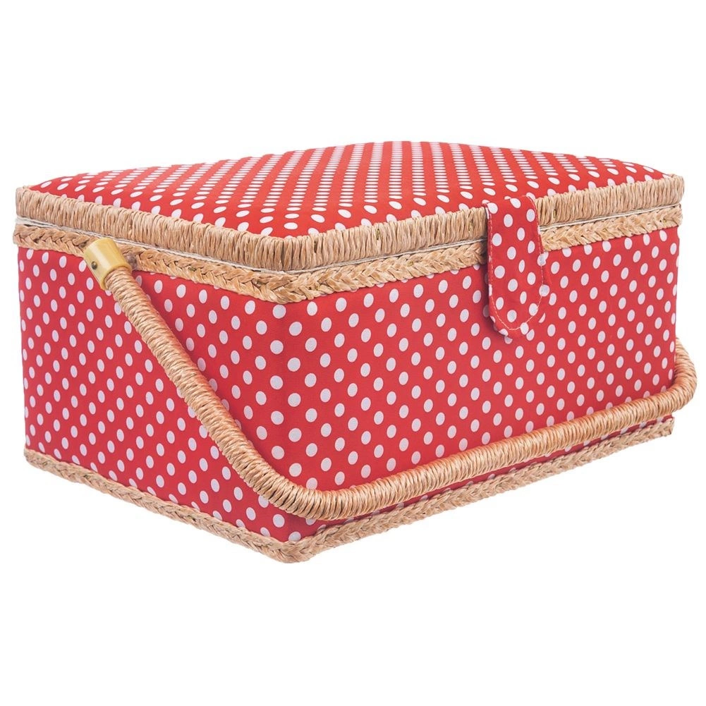 Czerwona tkanina z białymi kropkami oraz dekoracyjny splot dodają szyciu uroku, a koszyk świetnie wpasuje się w każdą domową pracownię.