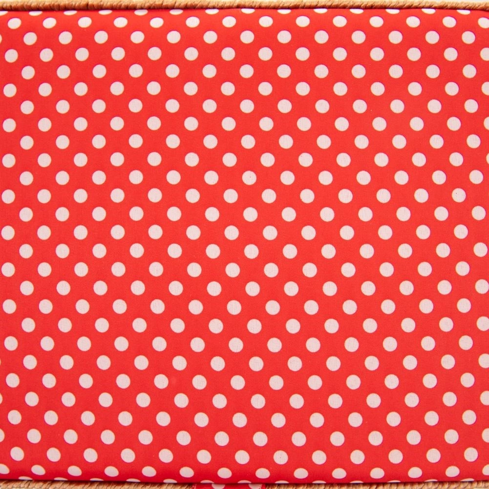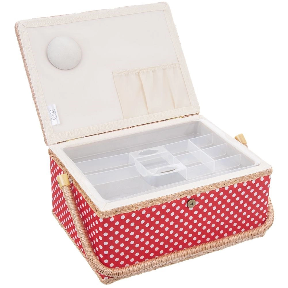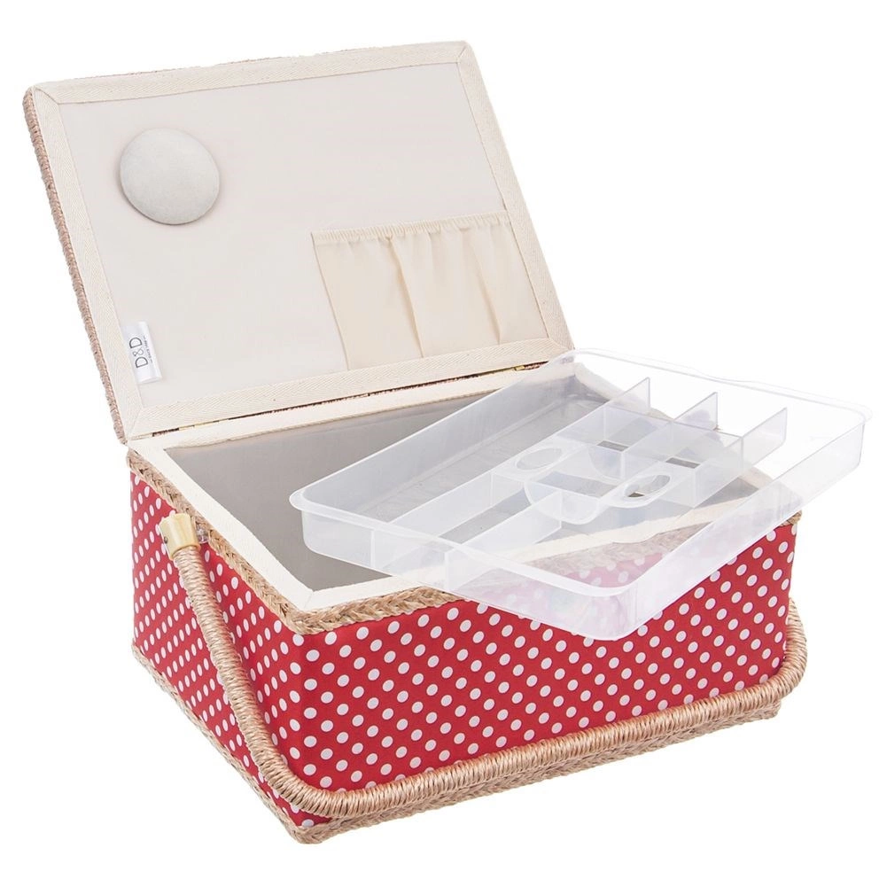 Czerwona tkanina z białymi kropkami oraz dekoracyjny splot dodają szyciu uroku, a koszyk świetnie wpasuje się w każdą domową pracownię.