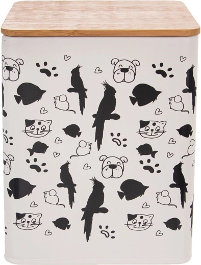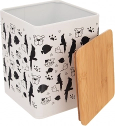 Stylowy metalowy pojemnik na karmę o pojemności 3 l utrzymuje granulki i przysmaki dłużej świeże. Ma kompaktowe wymiary 14 × 14 × 17 cm, bambusową pokrywkę z silikonową uszczelką dla doskonałej szczelności, jest trwały, praktyczny i dzięki zwierzęcemu motywowi stanowi dekoracyjny element Twojej kuchni.
