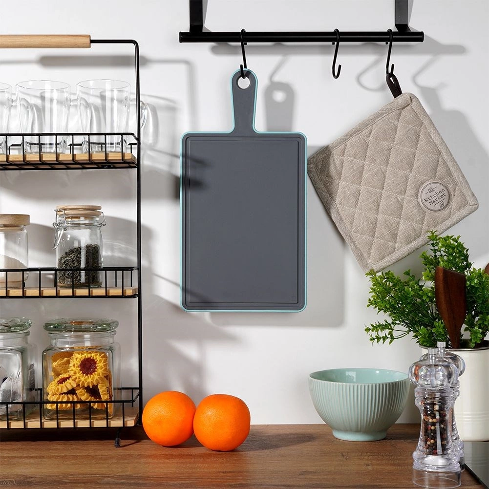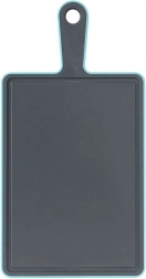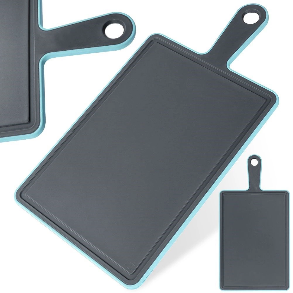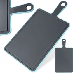 Praktyczna deska do krojenia do codziennego użytku w kuchni. Ma prostokątny kształt, antypoślizgową krawędź i wygodne ucho do przenoszenia i zawieszania. Poręczny rowek ociekowy zbiera soki z produktów, dzięki czemu blat pozostaje czysty.