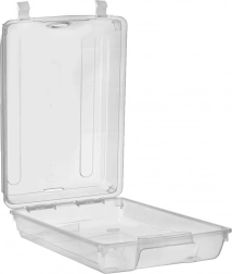Uchylna pokrywa z dwoma solidnymi klipsami chroni zawartość przed kurzem i wilgocią, a zintegrowany otwór wentylacyjny wspomaga cyrkulację powietrza.