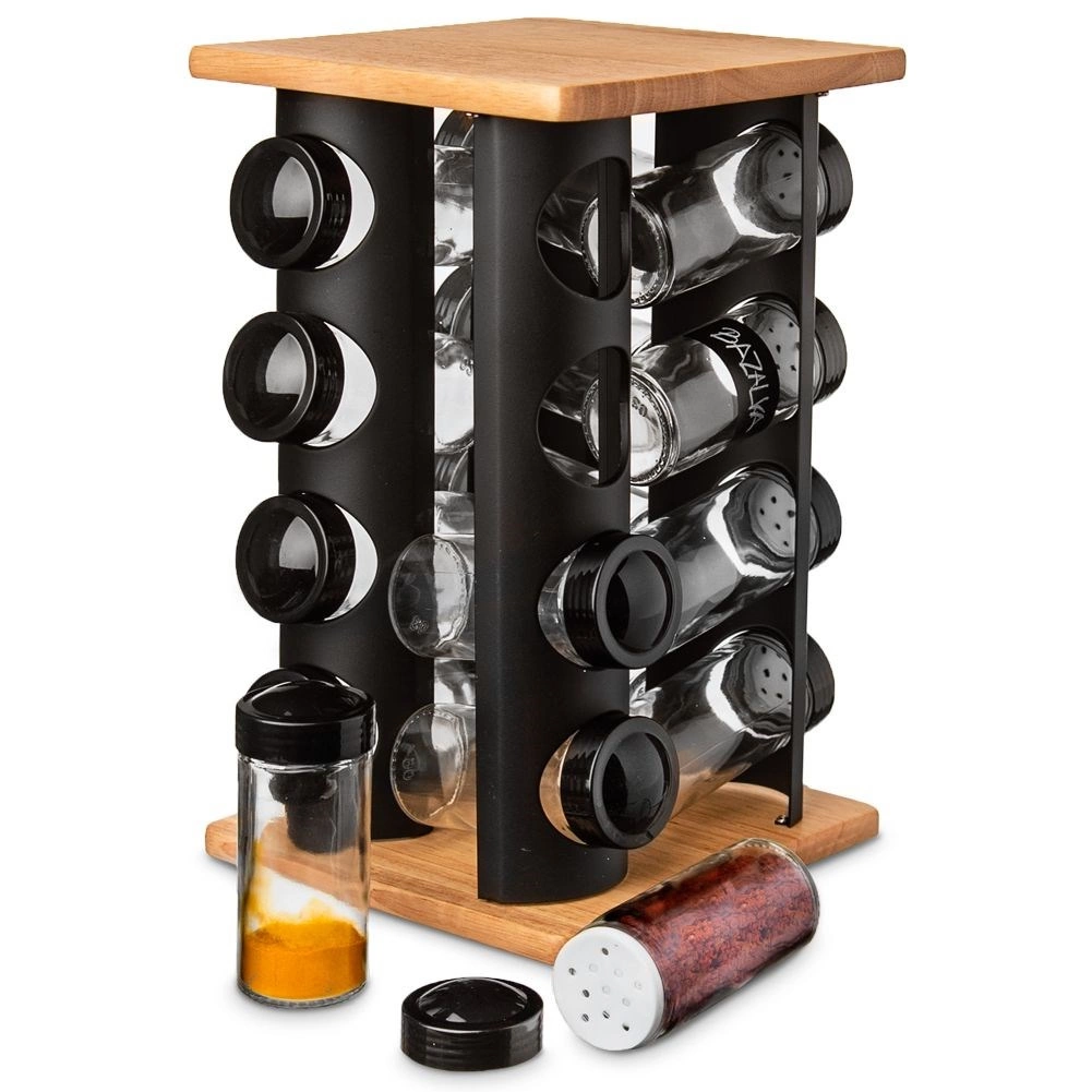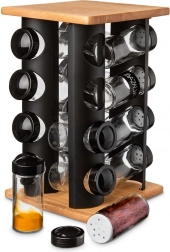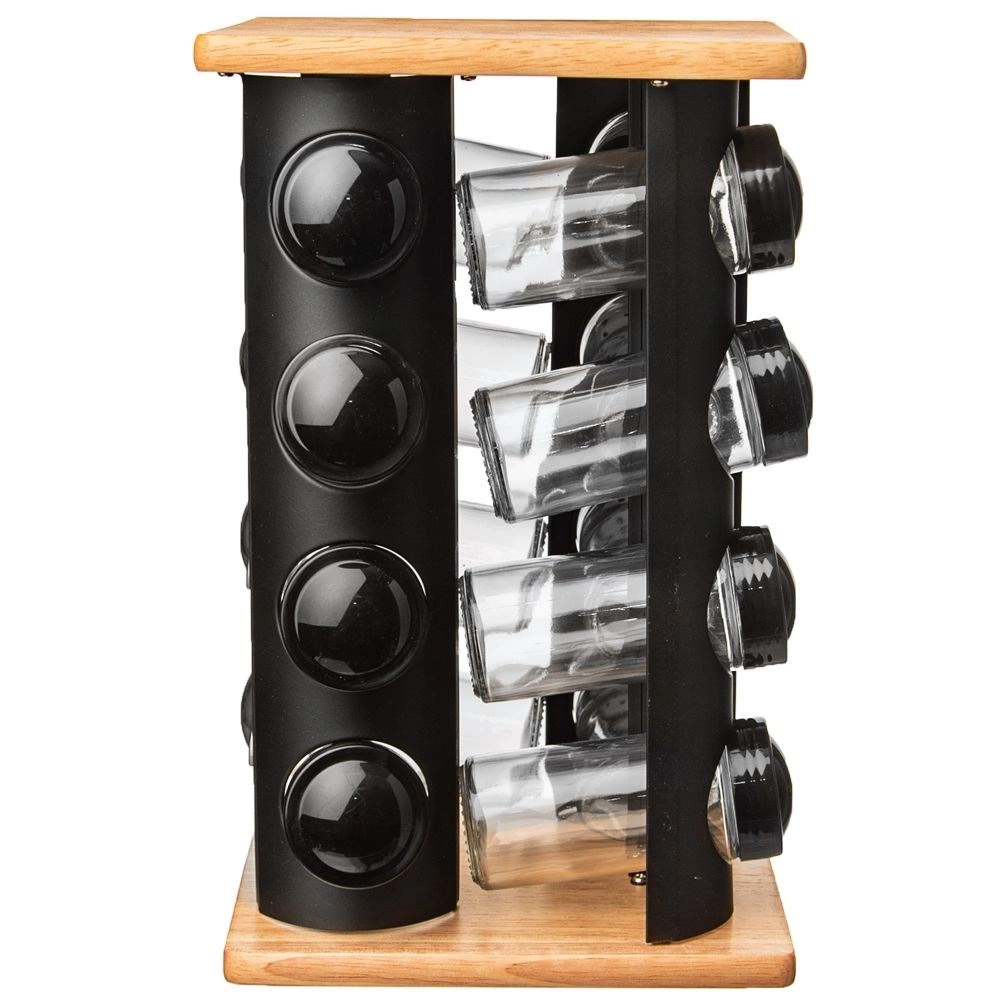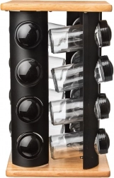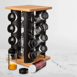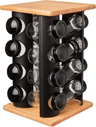 Zachowaj porządek w przyprawach i miej wszystko pod ręką. Obrotowy stojak z drewnianą górną i dolną płytą oraz czarną metalową konstrukcją mieści 16 słoiczków na przyprawy. Każdy słoiczek ma czarną nakrętkę i białe sitko dla wygodnego i równomiernego dozowania. Przezroczyste szkło umożliwia szybką kontrolę zawartości i ilości.