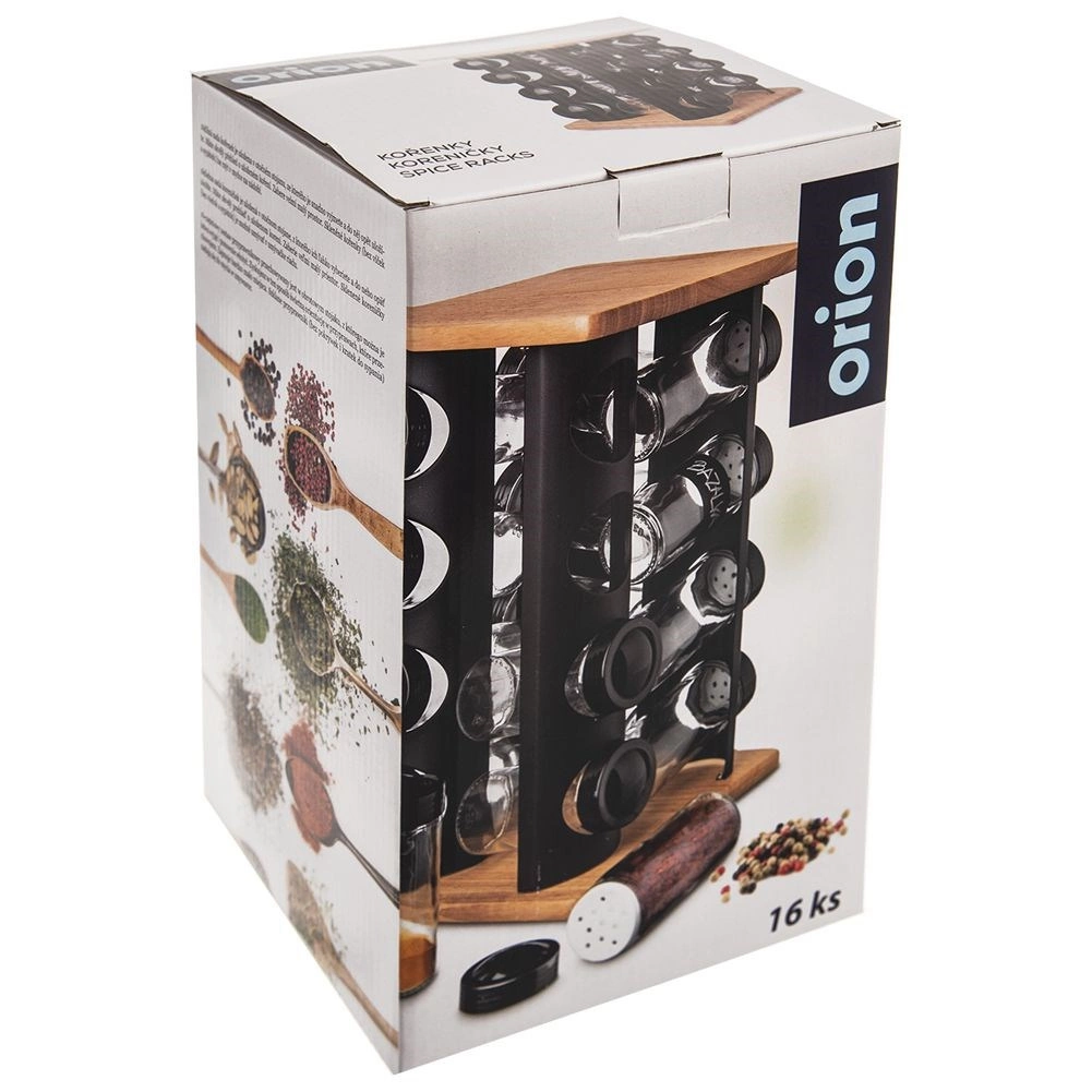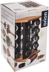 Elegancki obrotowy stojak na przyprawy z 16 szklanymi słoiczkami utrzyma Twoją kuchnię w porządku i nada jej stylu. Połączenie czarnego metalu i drewna jest solidne i trwałe, słoiczki o pojemności 80 ml mają nakrętki oraz sita do łatwego dozowania. Dzięki obrotowej konstrukcji szybko znajdziesz potrzebną przyprawę, a przezroczyste ścianki słoików umożliwią natychmiastową kontrolę zawartości. Szklane elementy można myć w zmywarce. Marka ORION.