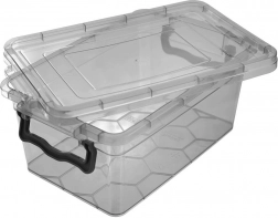 Praktyczne pudełko do przechowywania z wysokiej jakości, bezpiecznego dla zdrowia plastiku w ciemnoszarej, transparentnej wersji umożliwia natychmiastową kontrolę zawartości bez konieczności otwierania. Dzięki solidnej pokrywce z dwoma bocznymi klipsami wszystko pozostaje bezpiecznie zamknięte i chronione przed wilgocią oraz zabrudzeniami.