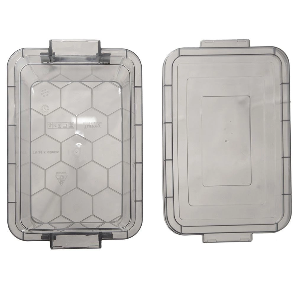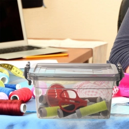 Dwa boczne zatrzaski niezawodnie zabezpieczają pokrywkę, chronią zawartość przed kurzem i wilgocią oraz ułatwiają przenoszenie.
