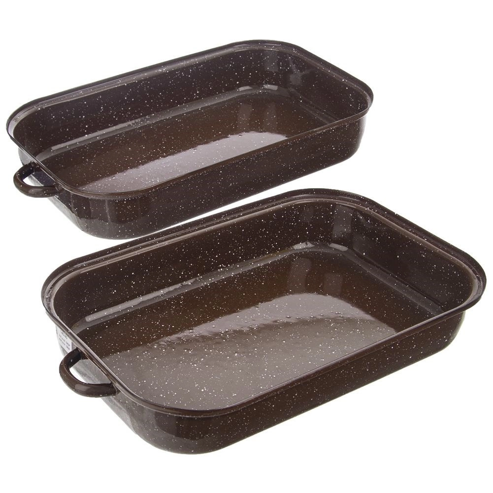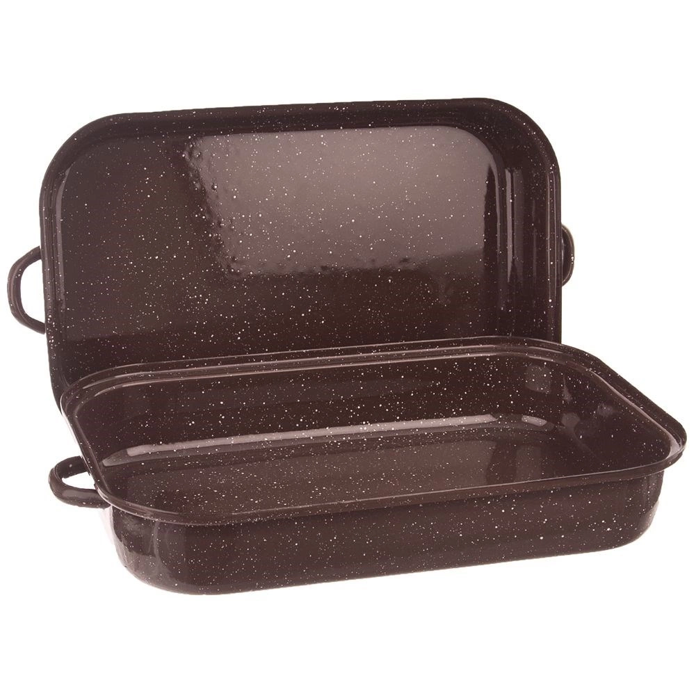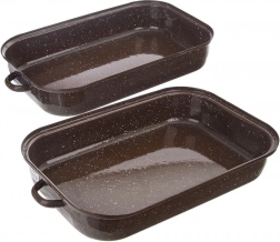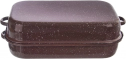 Pojemna emaliowana brytfanna z pokrywą o wymiarach 46 × 27,5 × 14,5 cm oferuje aż 2 oddzielne naczynia do pieczenia i serwowania. Wytrzymała stal emaliowana w kolorze brązowym, kompatybilna ze wszystkimi typami kuchenek, w tym indukcyjnymi, z właściwościami nieprzywierającymi dla łatwego czyszczenia oraz możliwością mycia w zmywarce. Oryginalny produkt marki ORION.