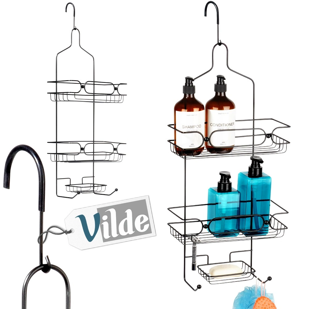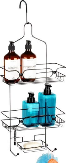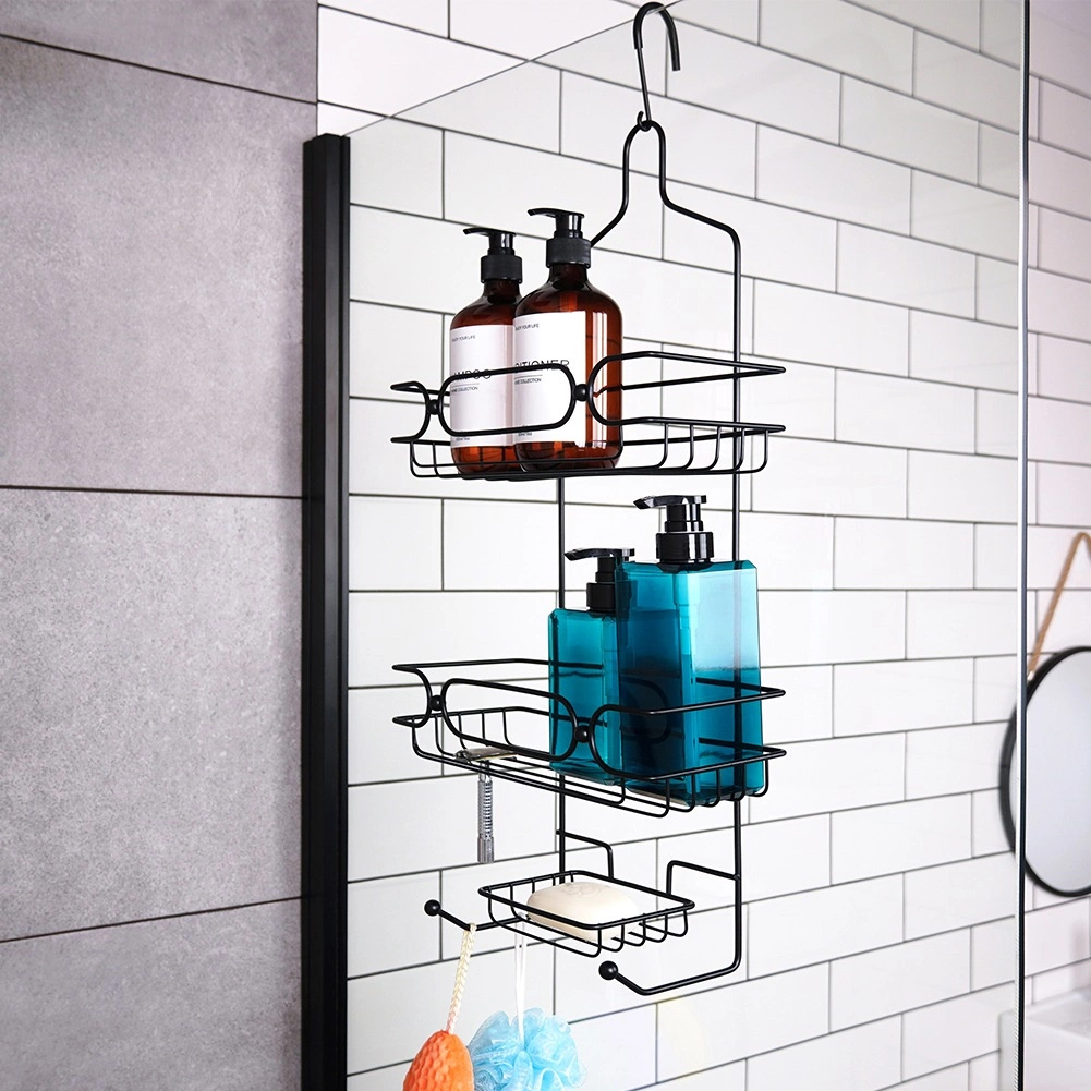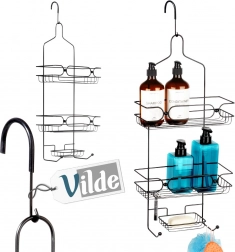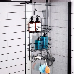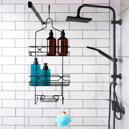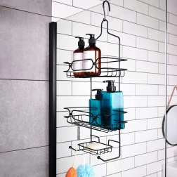 Dwie przestronne półki, zintegrowana mydelniczka i dolne haczyki utrzymają szampony, żele, gąbki i maszynki w porządku i w zasięgu ręki.