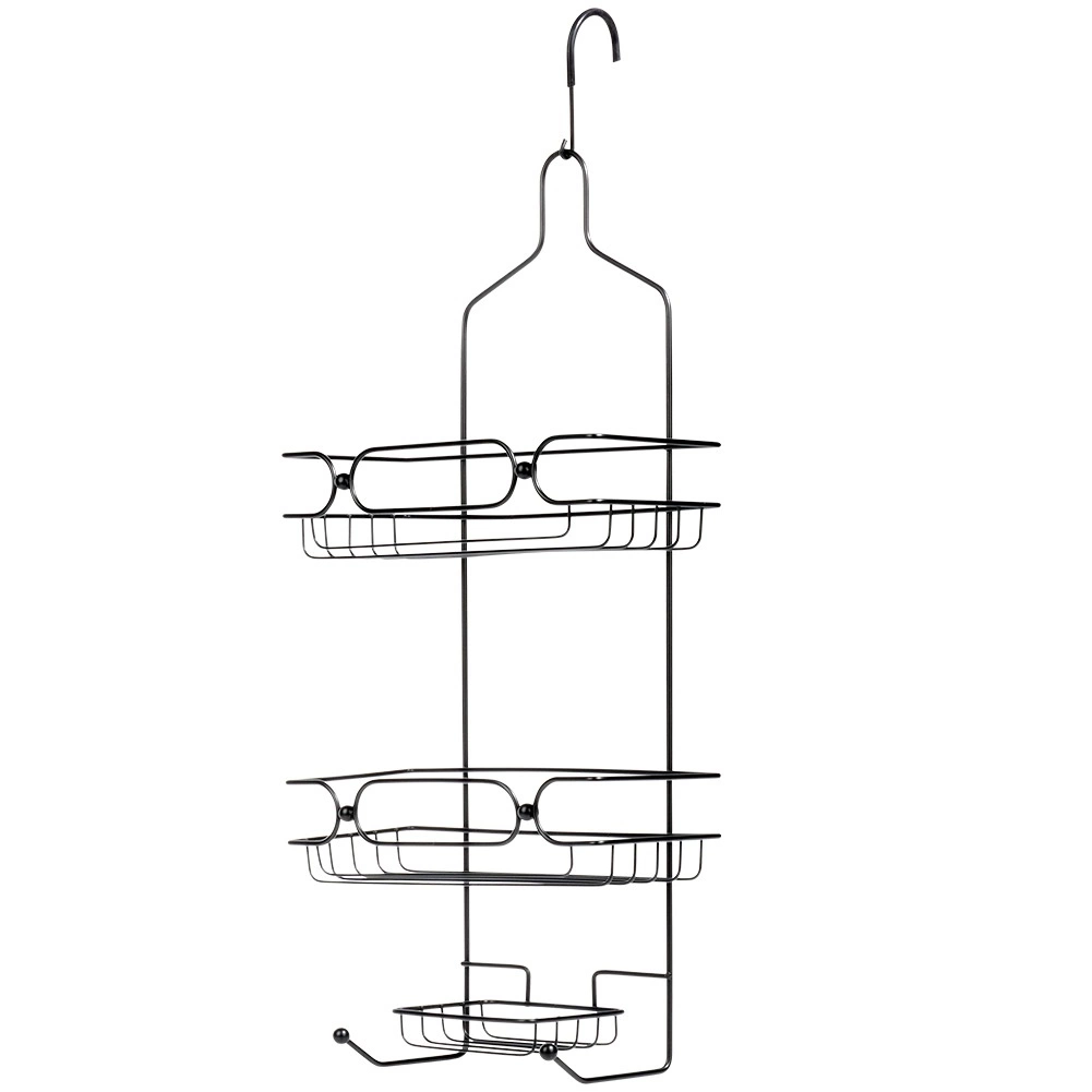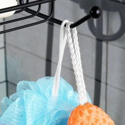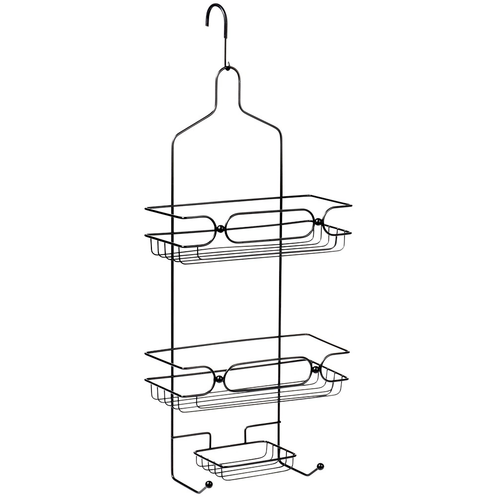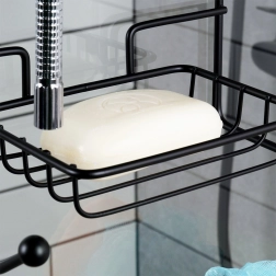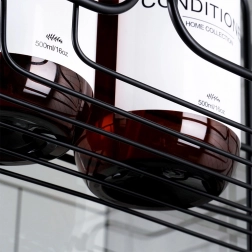 Wysokiej jakości czarno lakierowany metal jest solidny i odporny na korozję, dzięki czemu półka niezawodnie wytrzyma codzienne użytkowanie. Gumowa powłoka na haku chroni szkło i zapobiega zsuwaniu. Dwie duże półki pomieszczą szampony i żele, dolna mydelniczka oraz para haczyków są idealne na gąbki, maszynki czy szczotki.