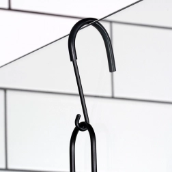 Hak pokryty gumą pewnie trzyma się na szklanej ściance lub drążku, a jednocześnie chroni powierzchnię przed uszkodzeniami.