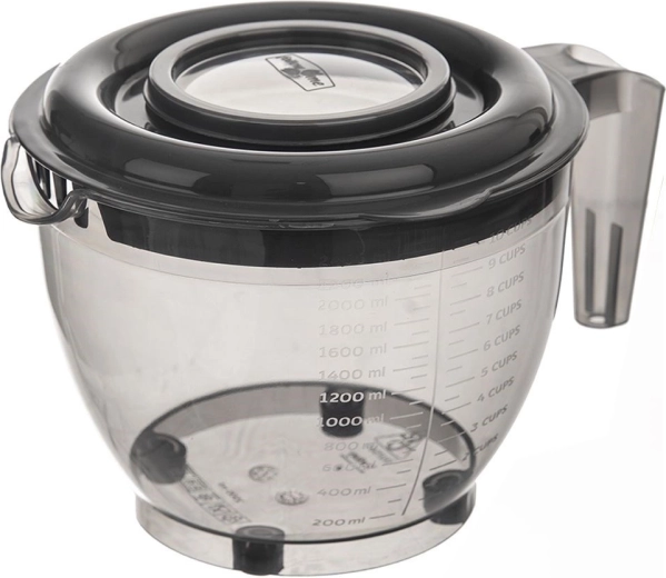 Praktyczna misa o pojemności 2,5 l do wygodnego mieszania, ubijania i nalewania. Ma dwuczęściową pokrywkę przeciw rozpryskom, wygodny uchwyt, precyzyjny dzióbek oraz zintegrowaną miarkę w ml i w cupach. Wykonana z trwałego, bezpiecznego dla zdrowia plastiku bez BPA, odpowiednia do zmywarki i mikrofalówki (bez pokrywki), ze stabilnymi, antypoślizgowymi nóżkami.