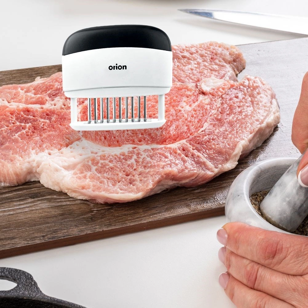 Ułatw sobie przygotowanie soczystych steków, kotletów i pieczeni. Ten nakłuwacz do mięsa z 20 igłami ze stali nierdzewnej przebija włókna mięśniowe w głąb, skracając czas obróbki cieplnej, zmiękczając strukturę i umożliwiając, by marynata przeniknęła równomiernie do środka. Efektem jest pełniejszy smak i większa soczystość.