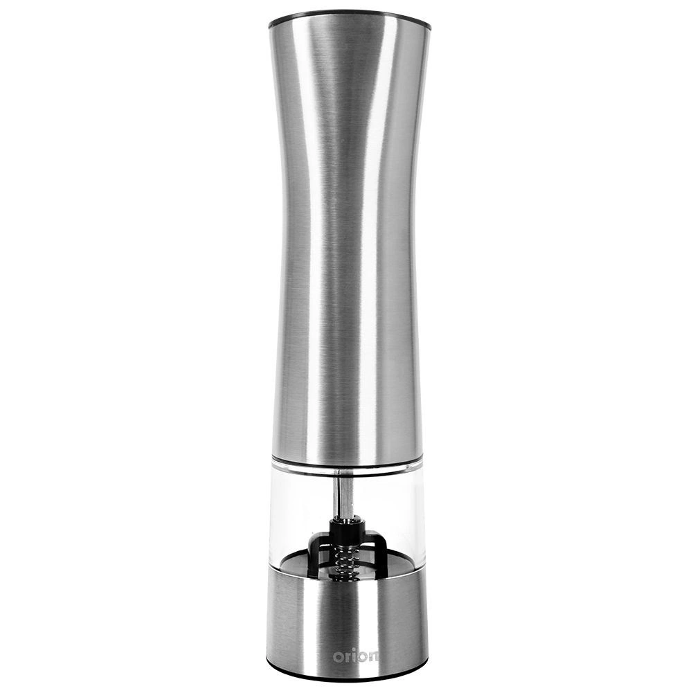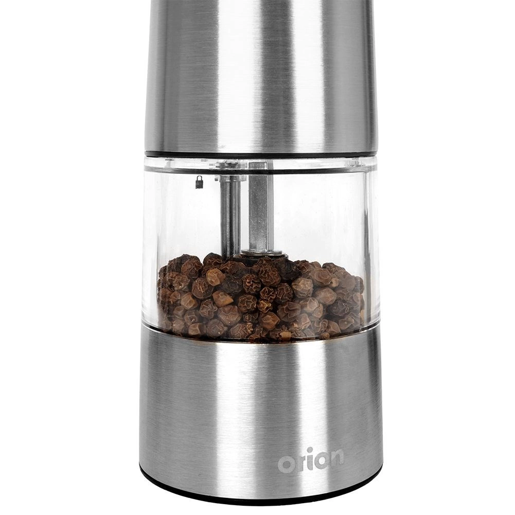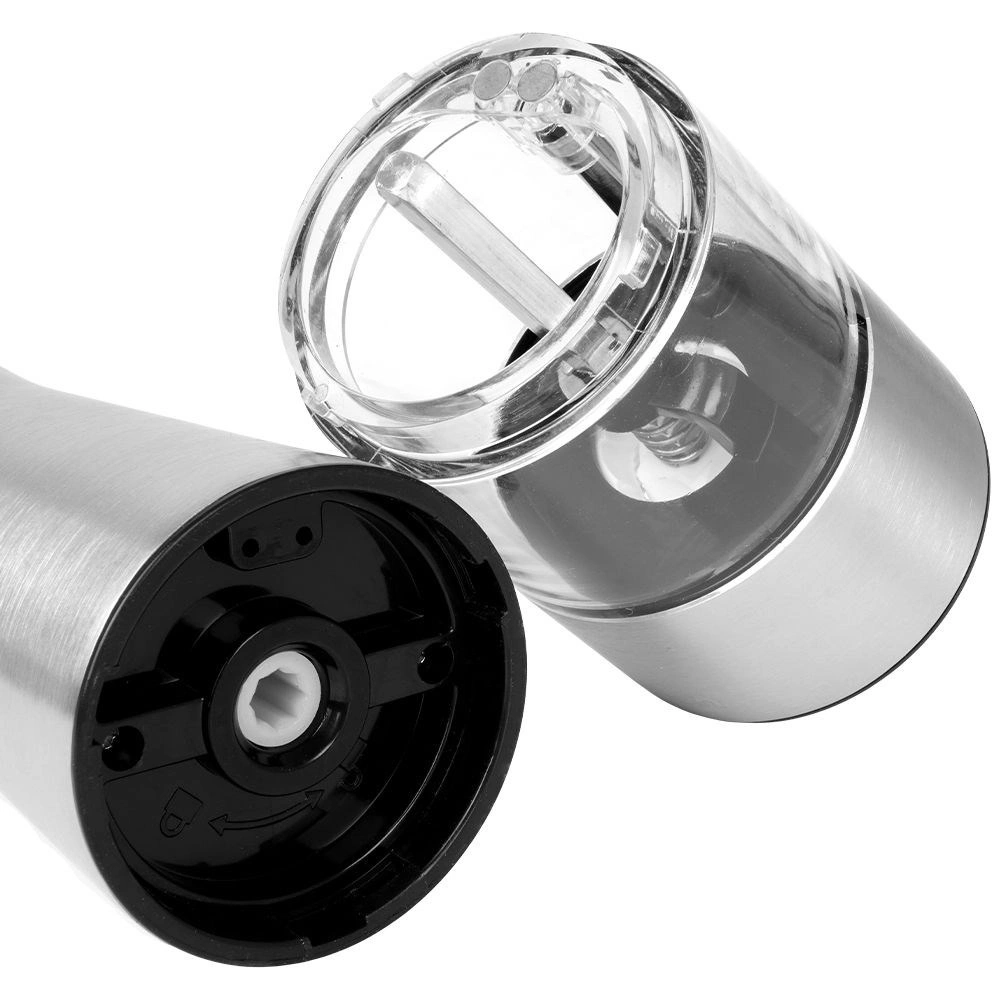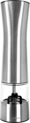 Elegancki elektryczny młynek ze stali nierdzewnej do pieprzu, soli i innych przypraw zapewnia świeżo mielone składniki jednym naciśnięciem. Wyposażony w ceramiczny mechanizm mielący, płynną regulację grubości mielenia oraz blokadę bezpieczeństwa. Zasilanie 6× AAA dla wygodnego sterowania jedną ręką i nowoczesnego wyglądu na każdym stole.