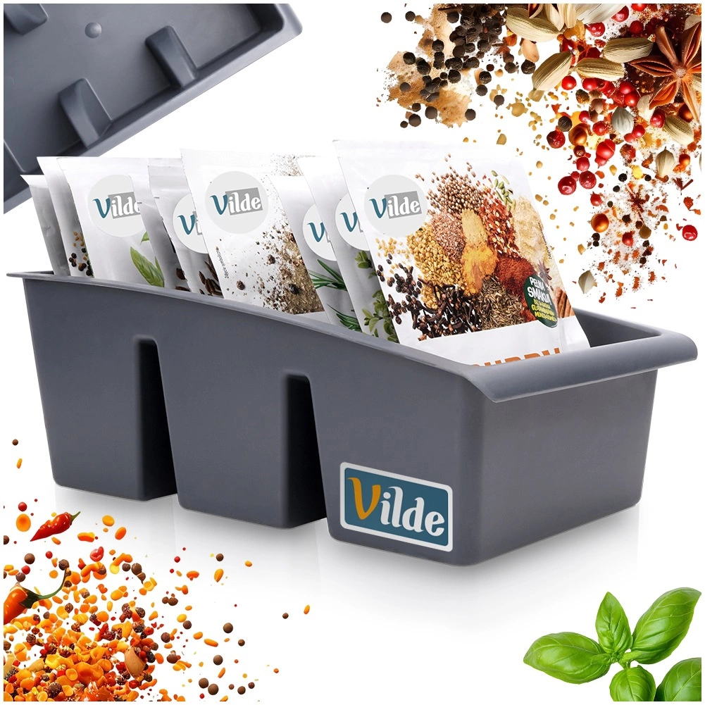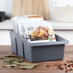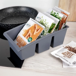 Utrzymaj porządek w kuchni dzięki temu praktycznemu organizerowi na torebki z przyprawami. Ma trzy przestronne przegrody, przejrzystą segregację, łatwy dostęp i wytrzymałe wykonanie z lekkiego plastiku w szarym kolorze. Świetnie mieści się w szufladzie, szafce i na blacie roboczym, pomagając mieć wszystkie torebki z przyprawami w jednym miejscu.
