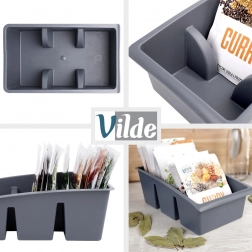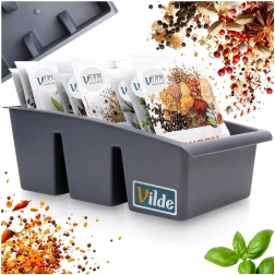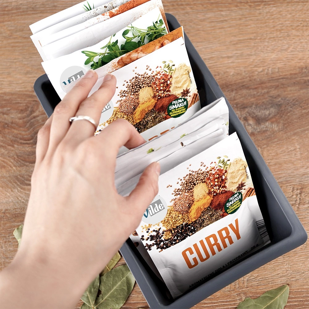 Dwie wewnętrzne przegrody tworzą trzy sekcje, w których łatwo posegregujesz przyprawy, zioła i inne torebki, aby zawsze szybko znaleźć to, czego potrzebujesz.