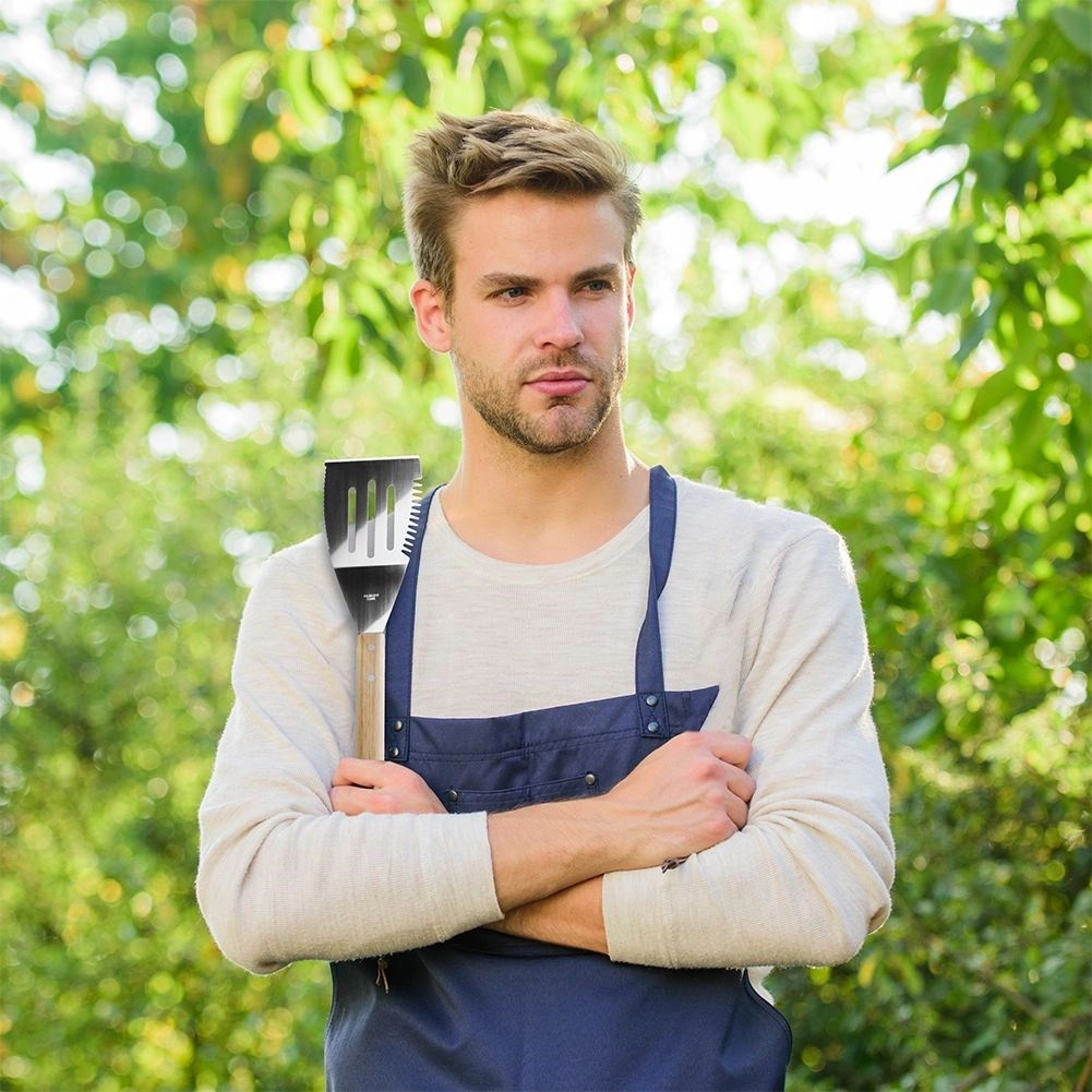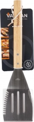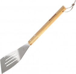 Łopatka VAGGAN łączy trwałą stal nierdzewną z ergonomiczną drewnianą rączką dla pewnego chwytu przy rozgrzanym grillu. Głowica ze szczelinami ułatwia odprowadzanie nadmiaru tłuszczu, a ząbkowane krawędzie i ostrzony bok umożliwiają krojenie burgerów, warzyw i wędlin bezpośrednio na ruszcie.