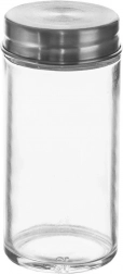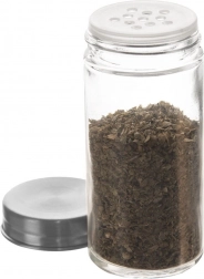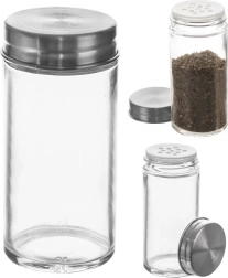 Pojemnik ma kompaktowe wymiary 9,5 × 4,5 cm i pojemność 100 ml, dzięki czemu łatwo mieści się w stojaku na przyprawy lub w szufladzie kuchennej. Szklany pojemnik można myć w zmywarce (bez dozownika i pokrywki), co ułatwia utrzymanie czystości i higieny. Doskonale nadaje się do soli, pieprzu, ziół i mieszanek przypraw.