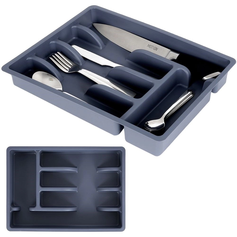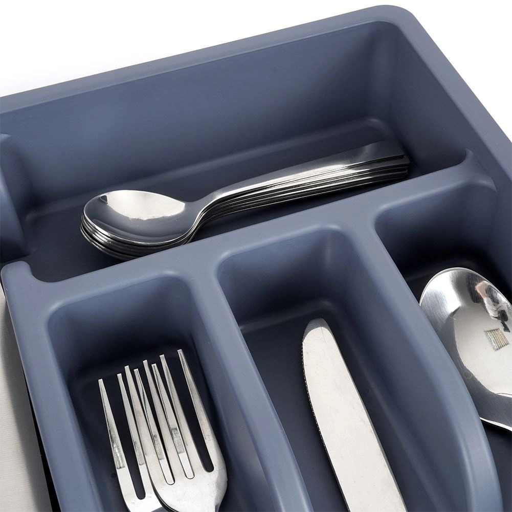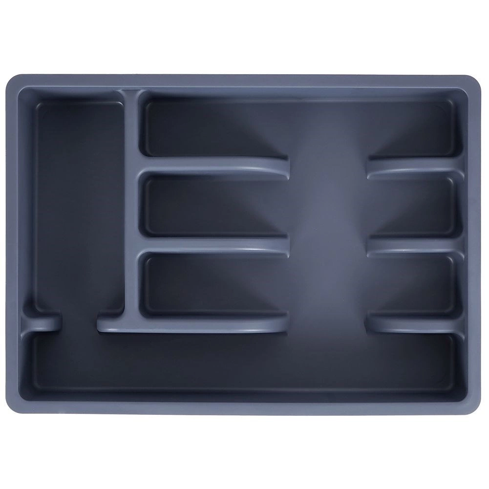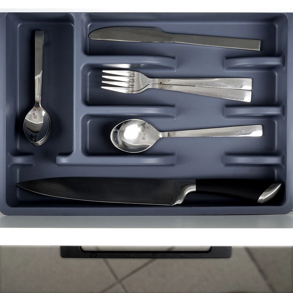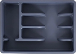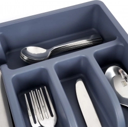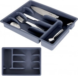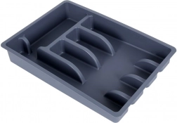 Organizer wykonano z wysokiej jakości, wytrzymałego plastiku w nowoczesnym szarym kolorze, dzięki czemu jest łatwy w utrzymaniu i posłuży przez długi czas. Wewnętrzne przegrody zapobiegają przesuwaniu się sztućców podczas otwierania szuflady, co zwiększa wygodę codziennego użytkowania.