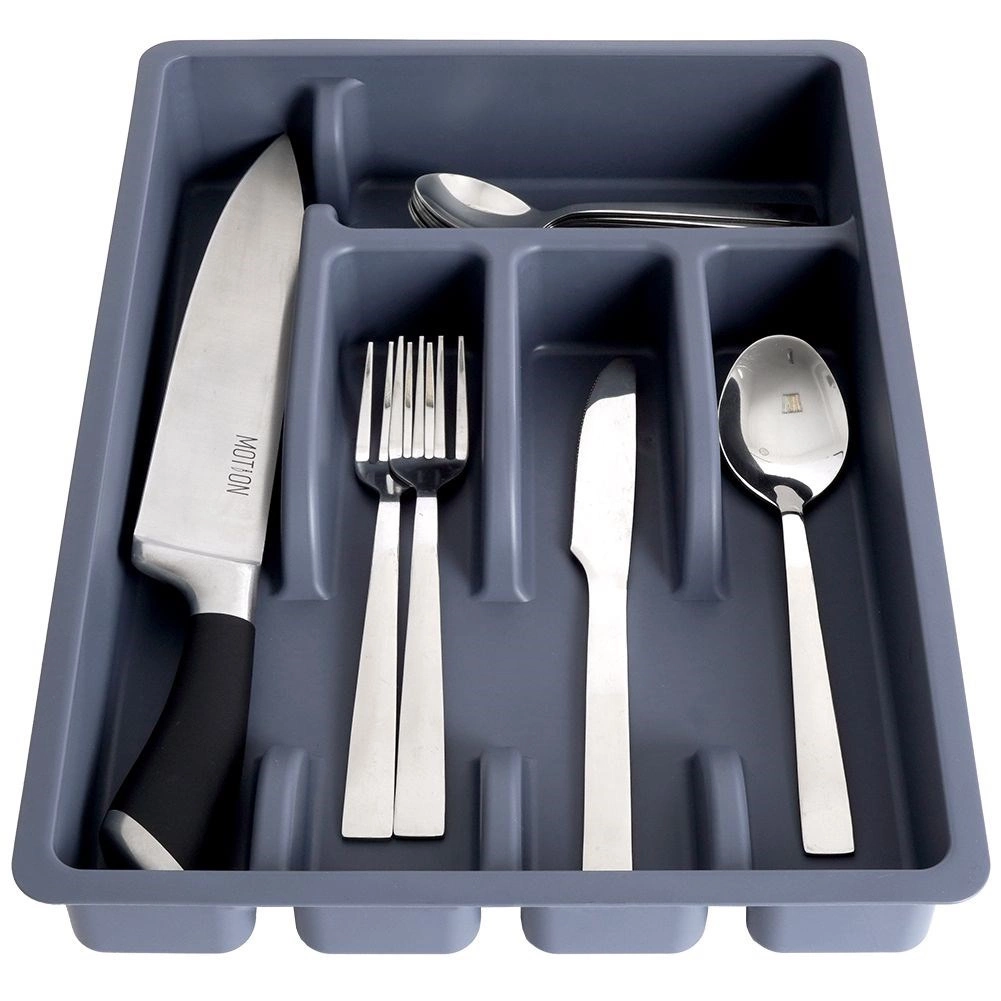 Trzy sekcje na sztućce, oddzielna przegródka na łyżeczki i jedna długa część na akcesoria kuchenne utrzymają wszystko na swoim miejscu.