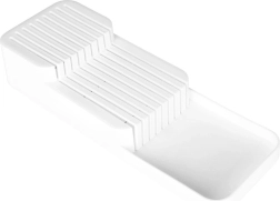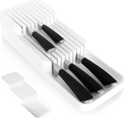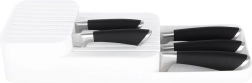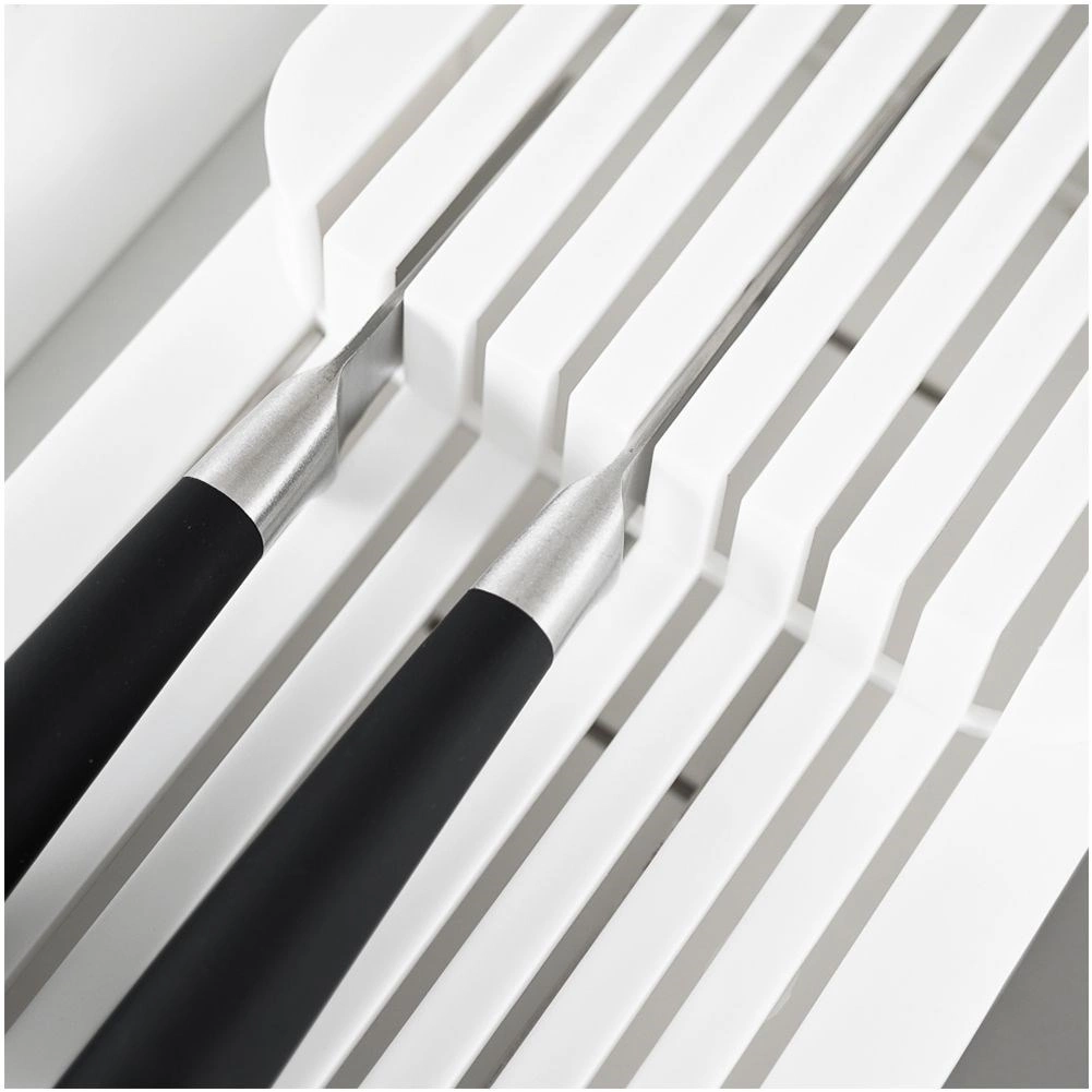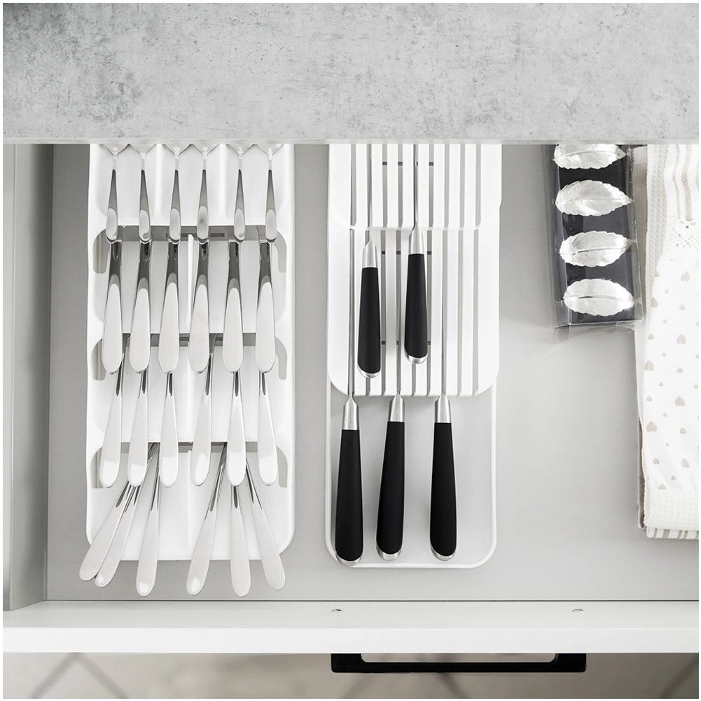 Praktyczny i oszczędzający miejsce organizer na noże pomoże utrzymać ostrza przejrzyście i bezpiecznie ułożone. Dwupoziomowa konstrukcja oszczędza miejsce w szufladzie, a profilowane rowki utrzymują każdy nóż na swoim miejscu. Minimalistyczny biały design pasuje do każdej nowoczesnej kuchni.