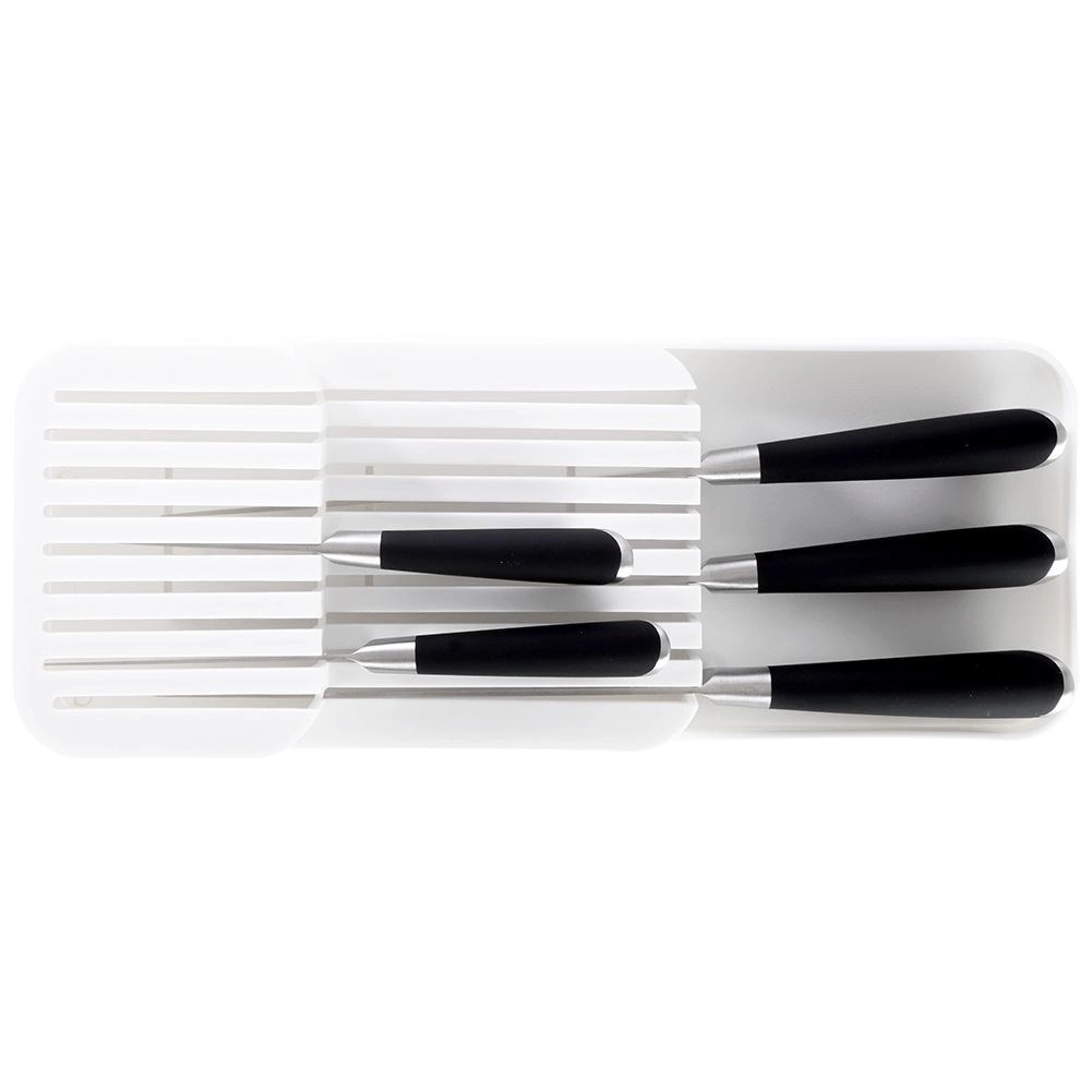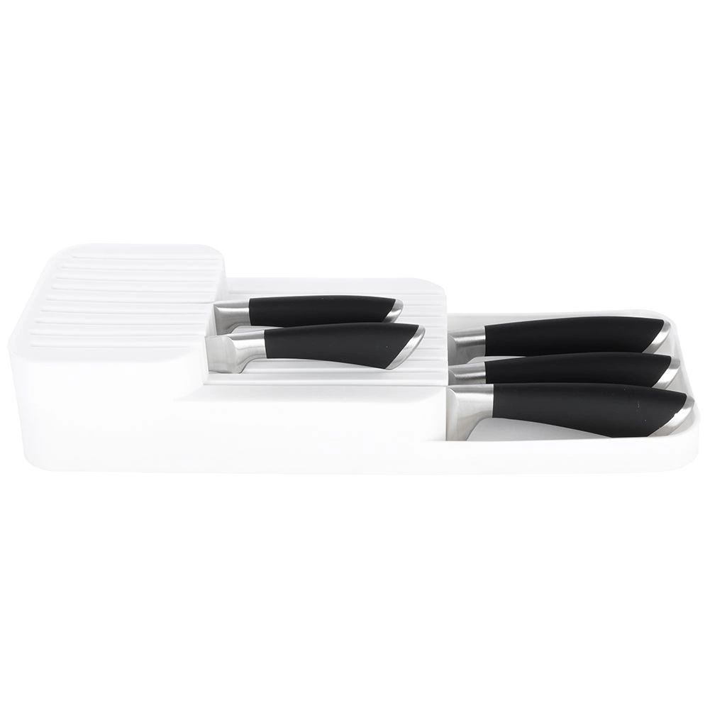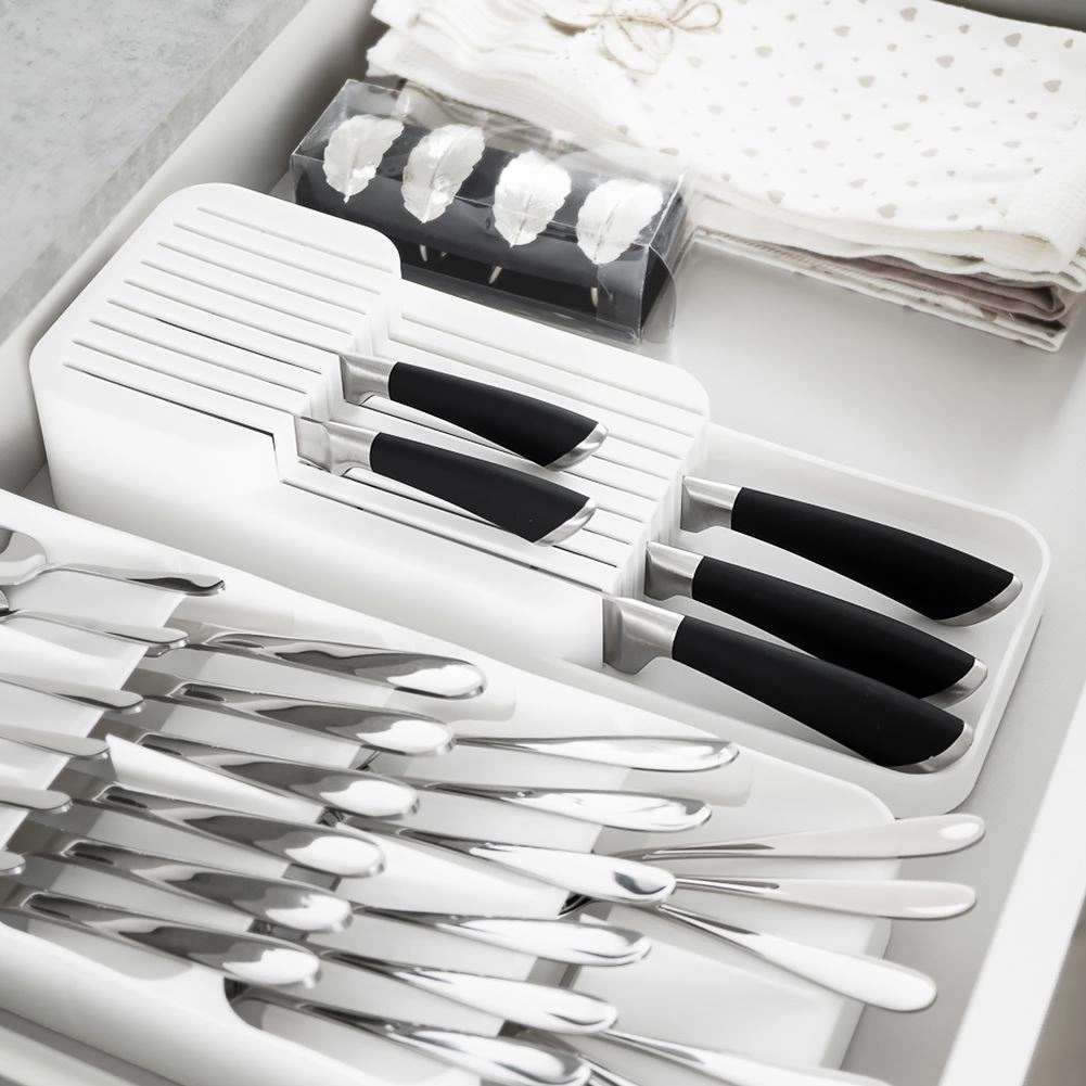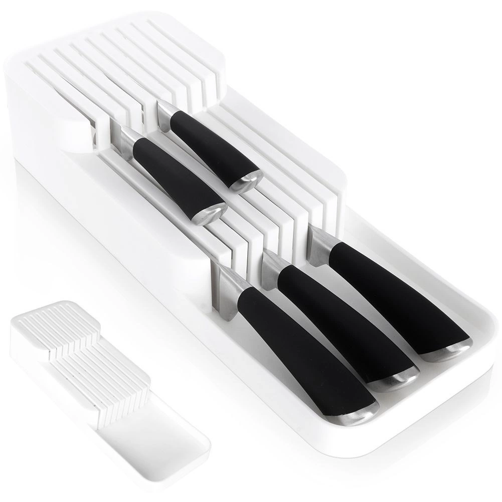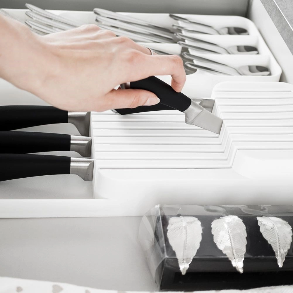 Utrzymaj porządek w kuchni dzięki temu białemu organizerowi na noże do szuflady o wymiarach 39 × 14,5 × 7,5 cm. Oferuje aż 18 slotów na krótkie i długie noże, dwupoziomowe przechowywanie oszczędzające miejsce oraz trwałe wykonanie z wysokiej jakości plastiku. Jest kompaktowy, bezpieczny i dzięki uniwersalnym wymiarom pasuje do większości kuchennych szuflad.