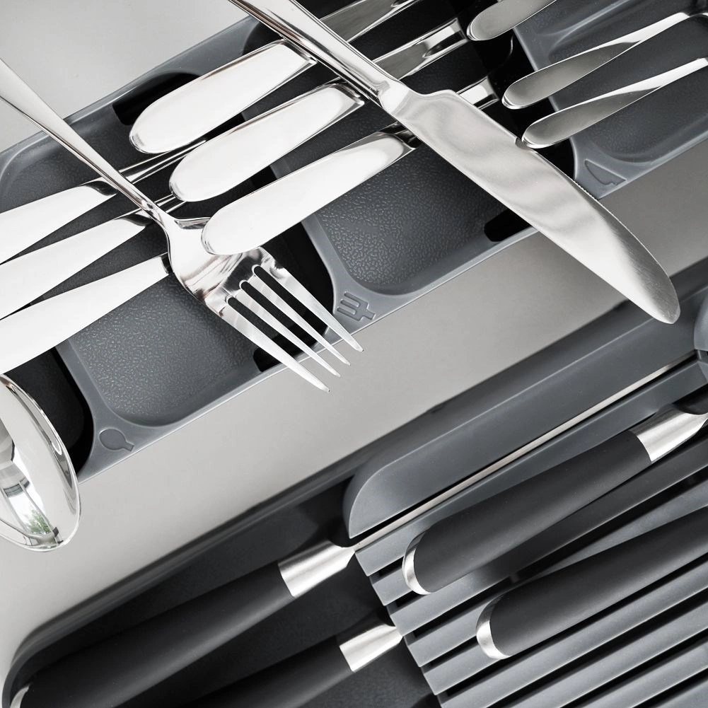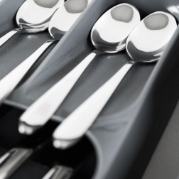 Sprytne, stopniowane ułożenie utrzymuje łyżki, widelce i noże oddzielnie, zapewnia łatwy dostęp i oszczędza miejsce w szufladzie.