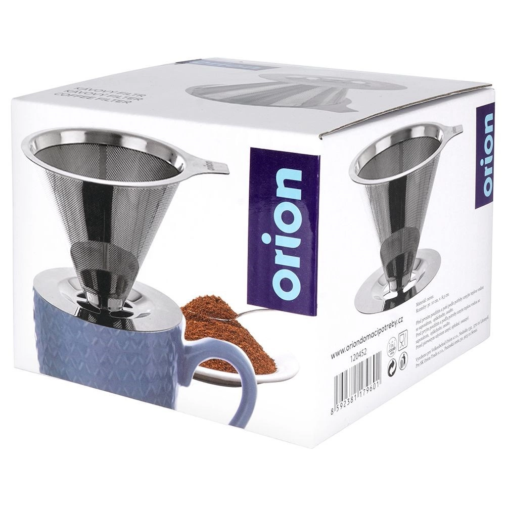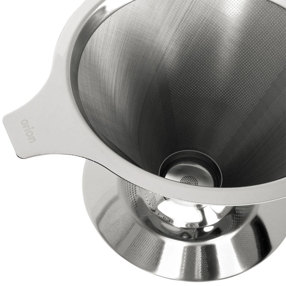 Odkryj prostotę ręcznego parzenia kawy z nierdzianym filtrem ORION. Dzięki drobnej stalowej siateczce delektujesz się pełnym smakiem i aromatem bez papierowego posmaku i zbędnych odpadów. Wystarczy postawić filtr na kubku lub dzbanku, wsypać mieloną kawę i powoli zalewać gorącą wodą.